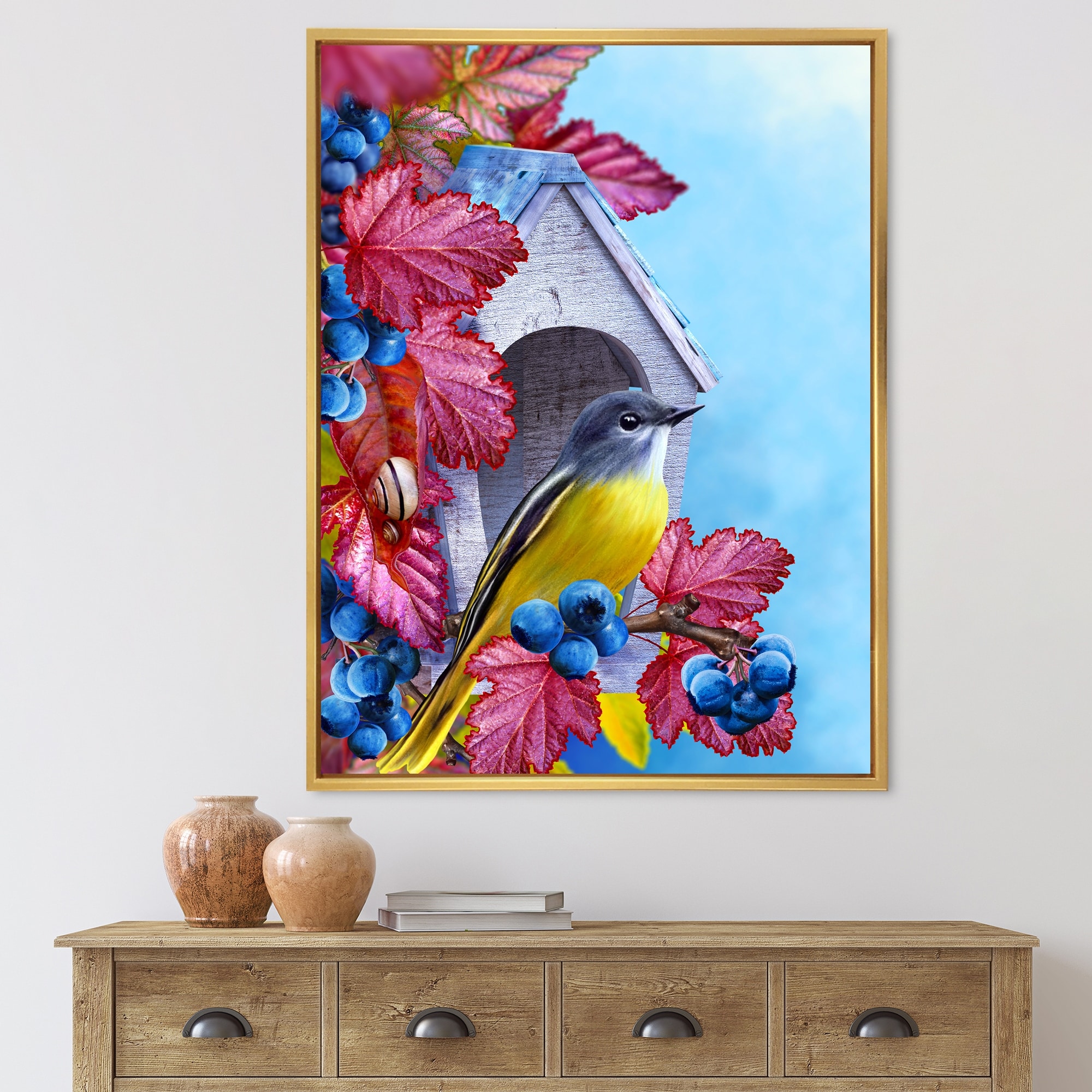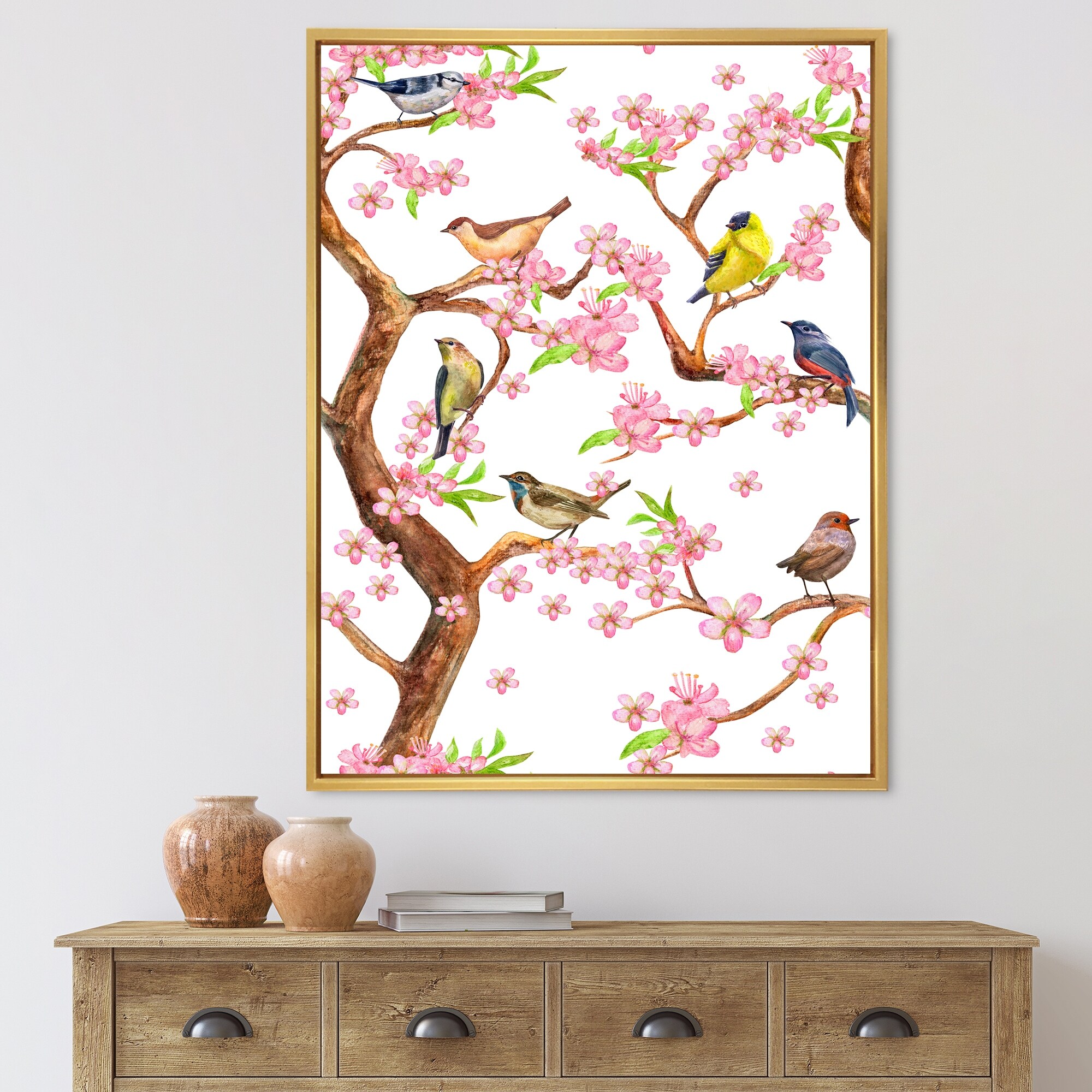 Designart "Colorful Little Birds on Spring Flow" Traditional Framed Canvas Wall Art Print