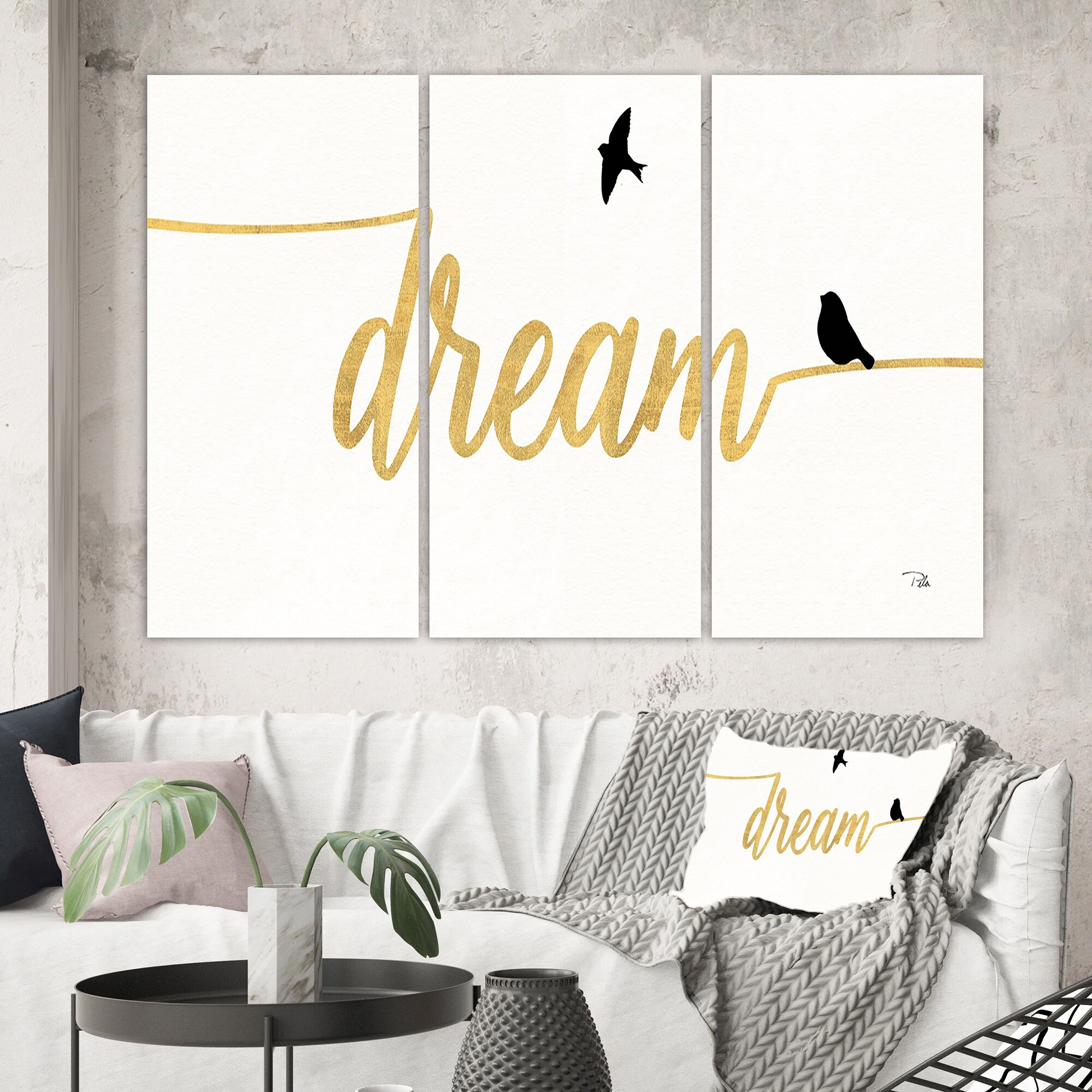 Designart "Family of Birds on Gold Words II" Cottage Canvas Artwork Print