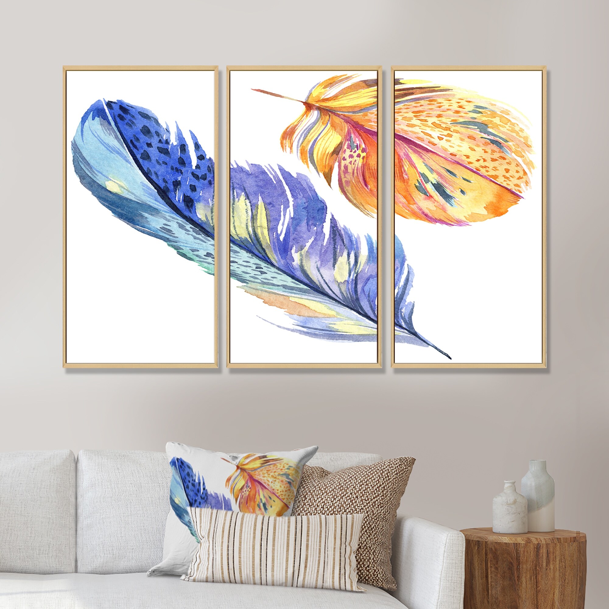 Designart "Colorful Blue Bird Feather From Wing" Bohemian & Eclectic Framed Art Prints Set of 3 - 4 Colors of Frames