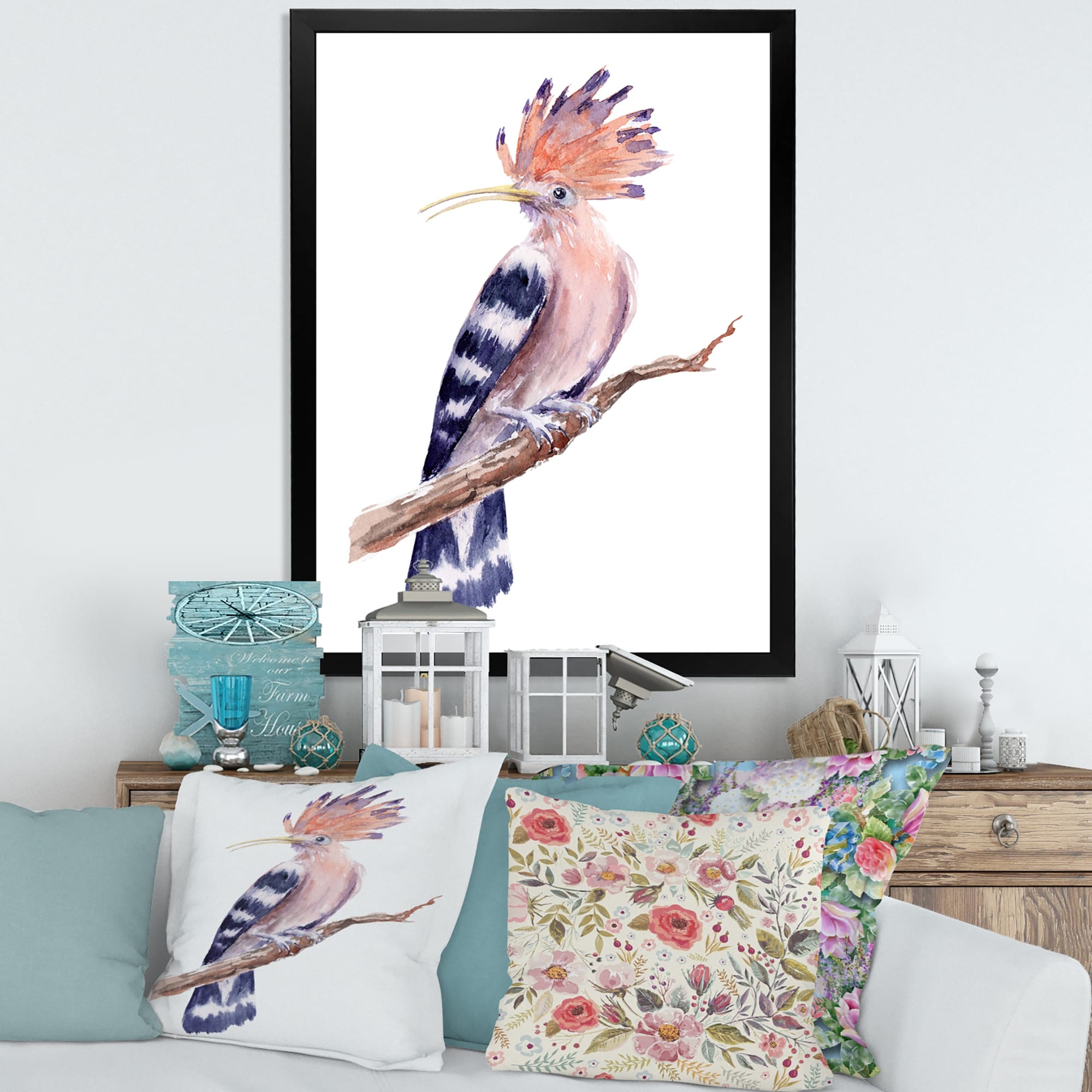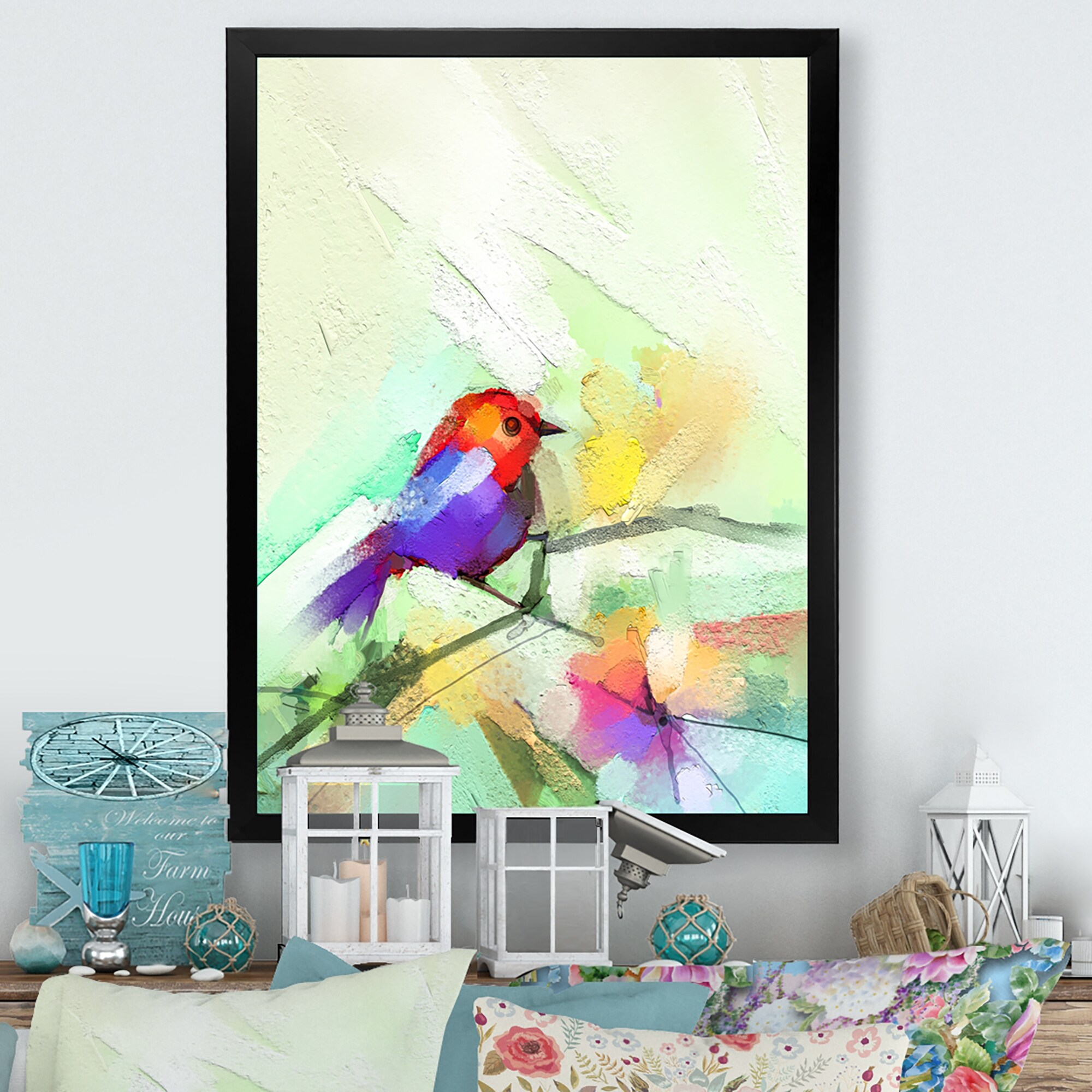 Designart "Multi-Color Bird on Tree" Modern Farmhouse Framed Art Print