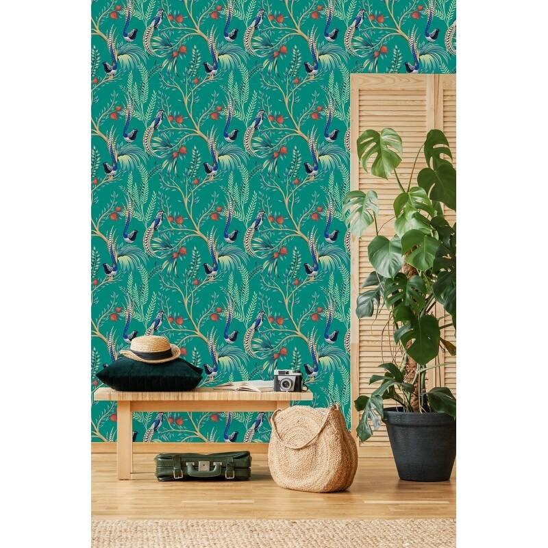 Exotic Birds on Green Wallpaper Peel and Stick and Prepasted