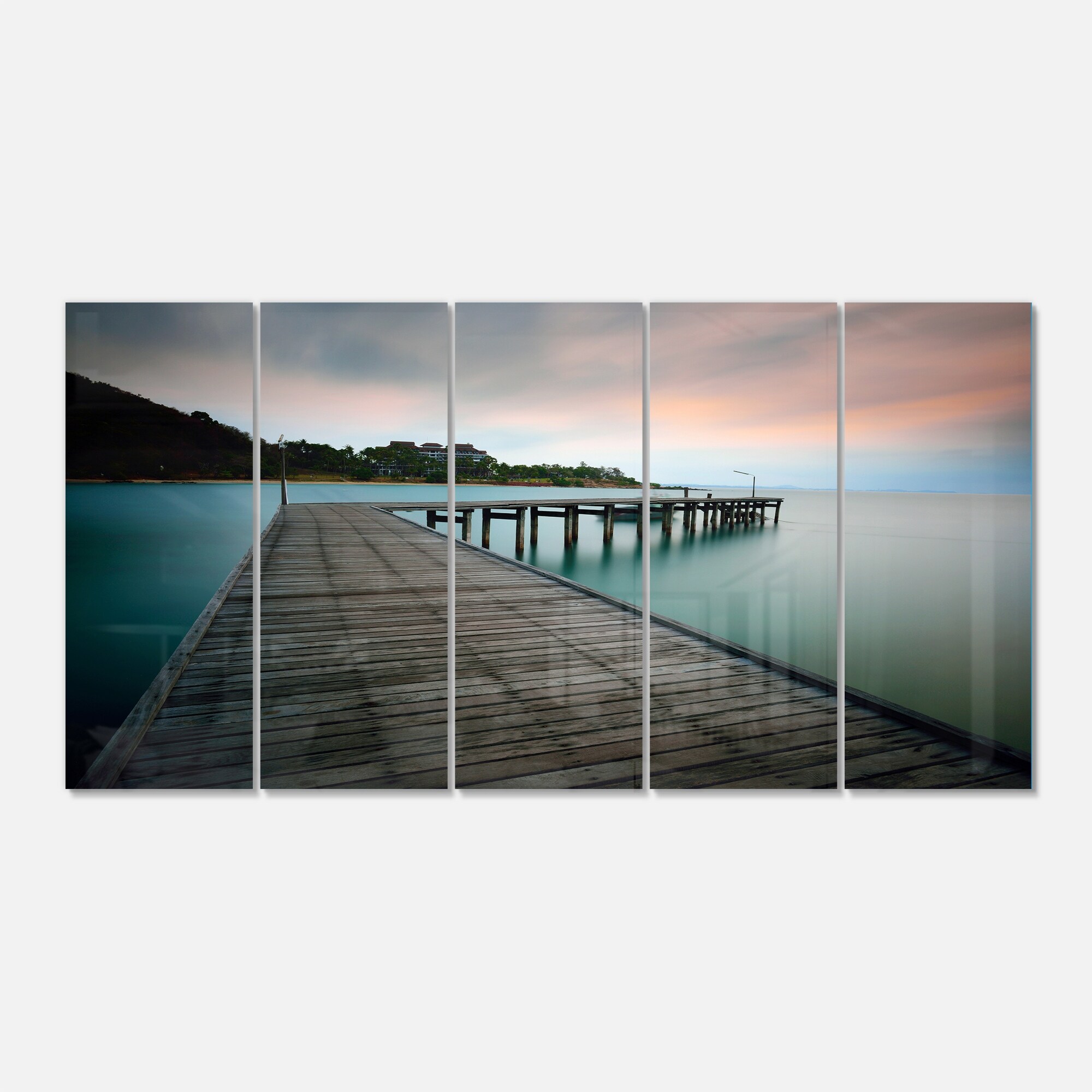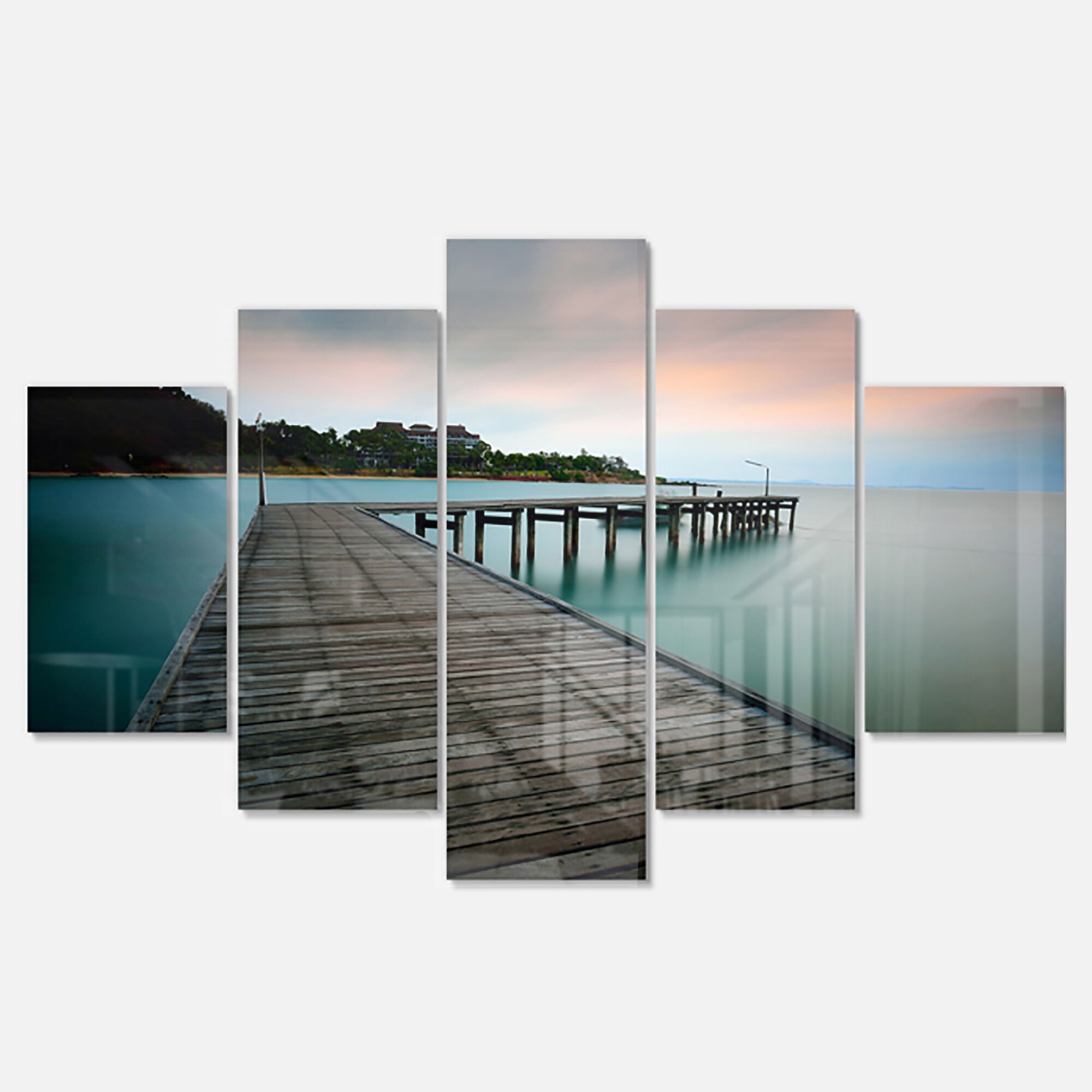 Designart 'Wooden Bridge into Blue Sea' Modern Bridge Glossy Metal Wall Art
