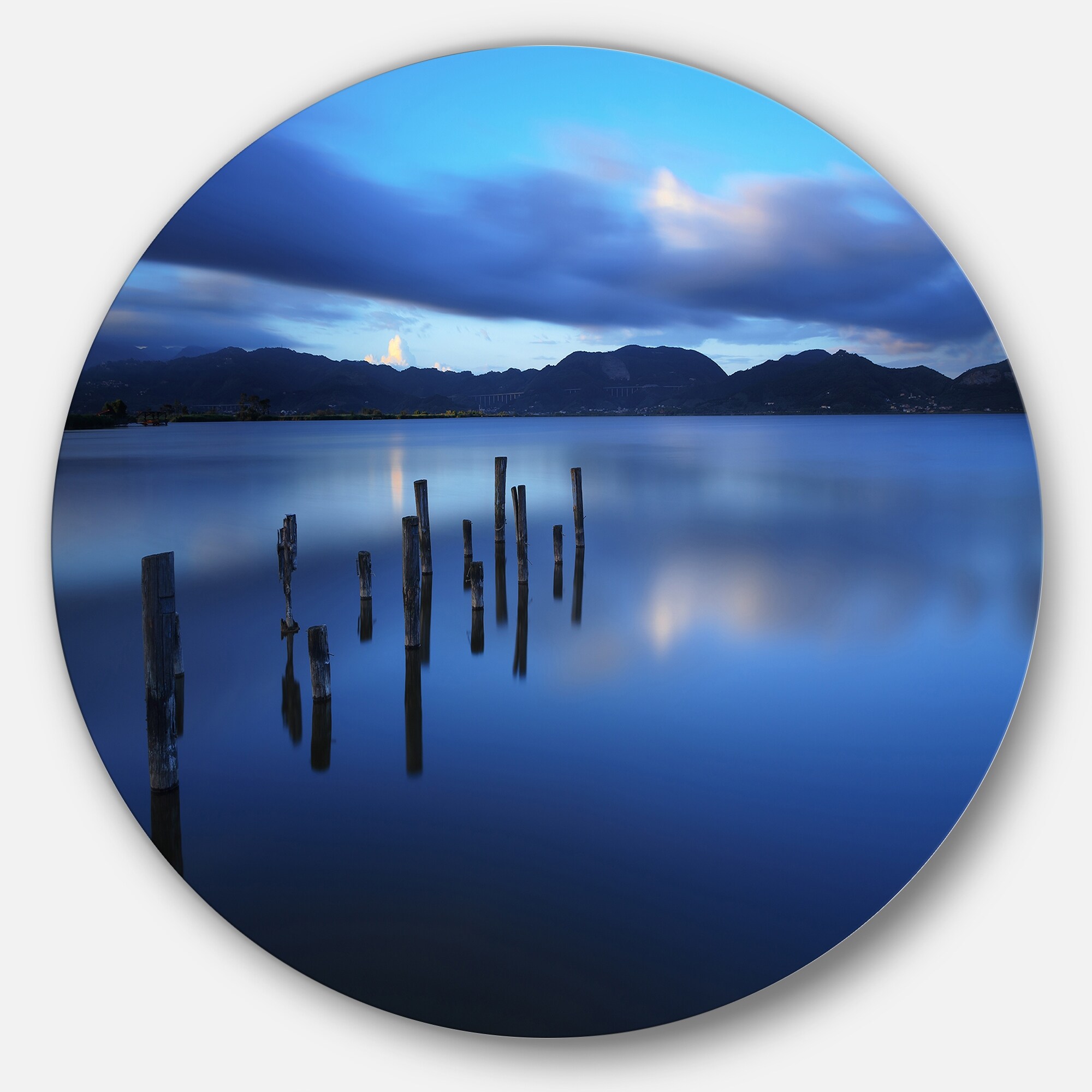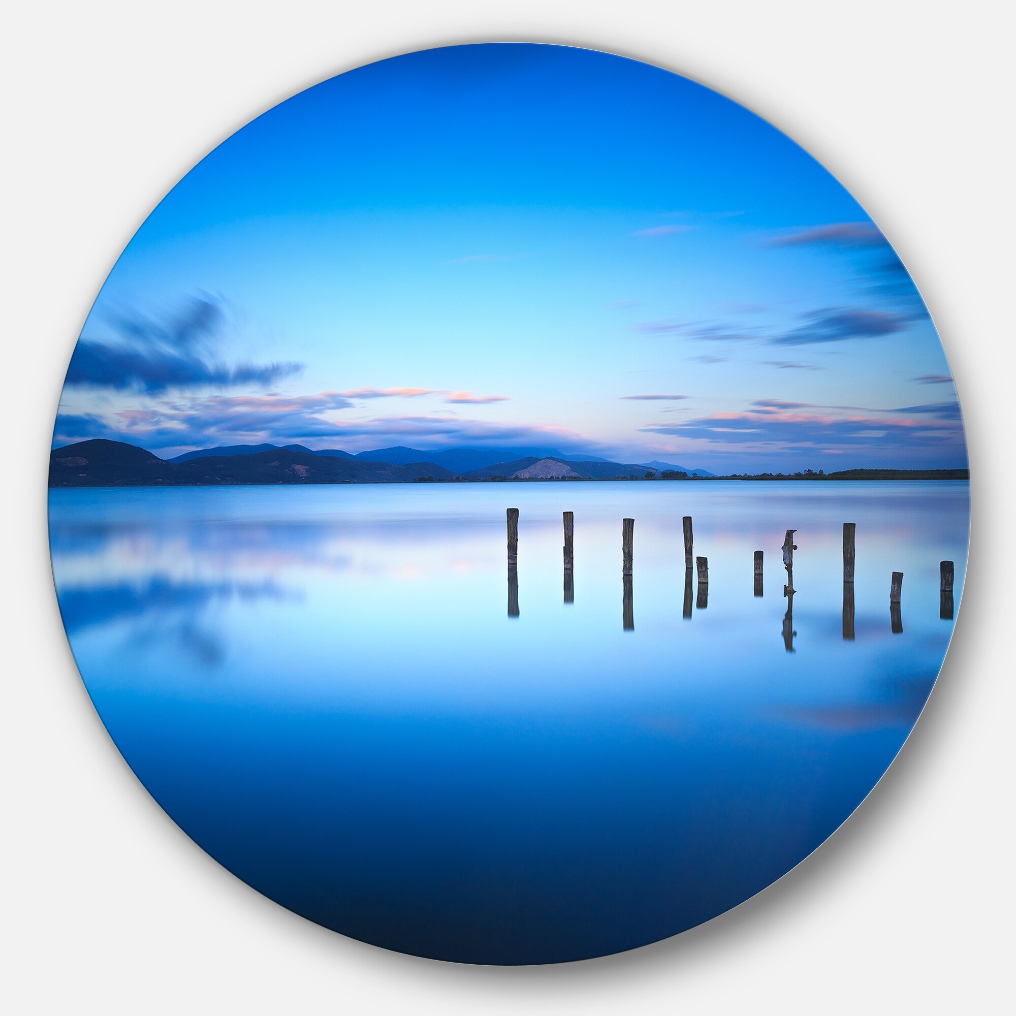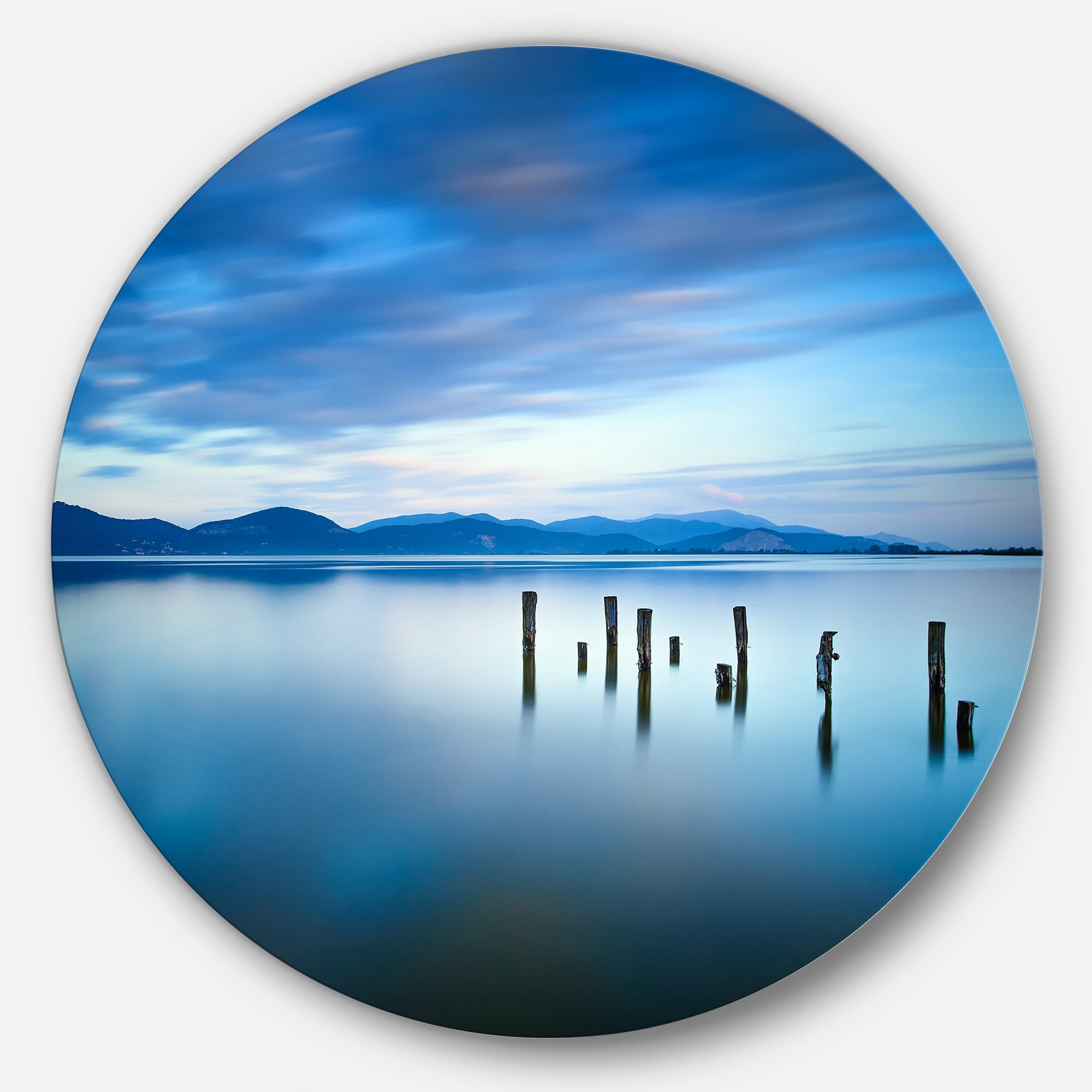 Designart 'Dark Blue Sea with Pier Remains' Seascape Photo Large Disc Metal Wall art