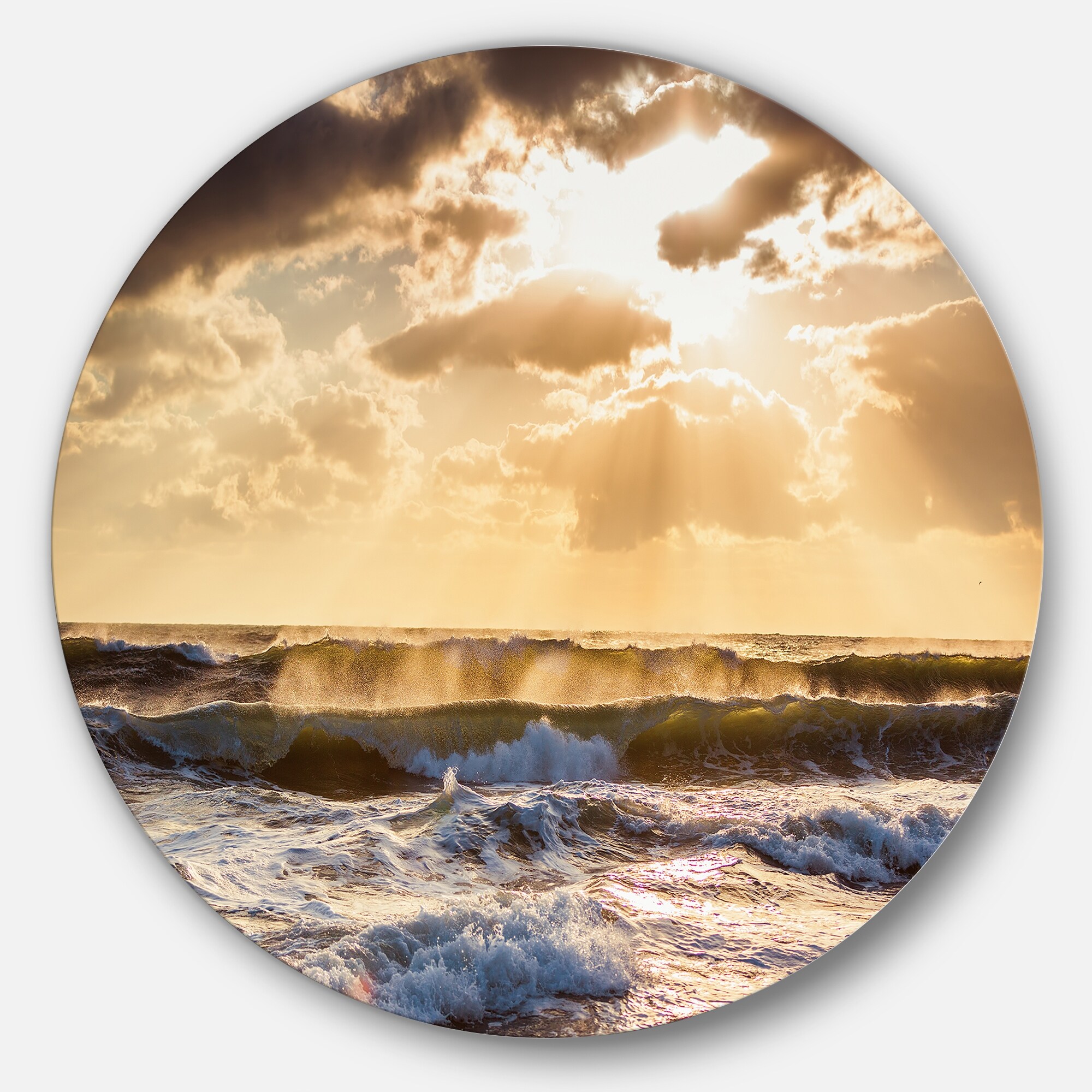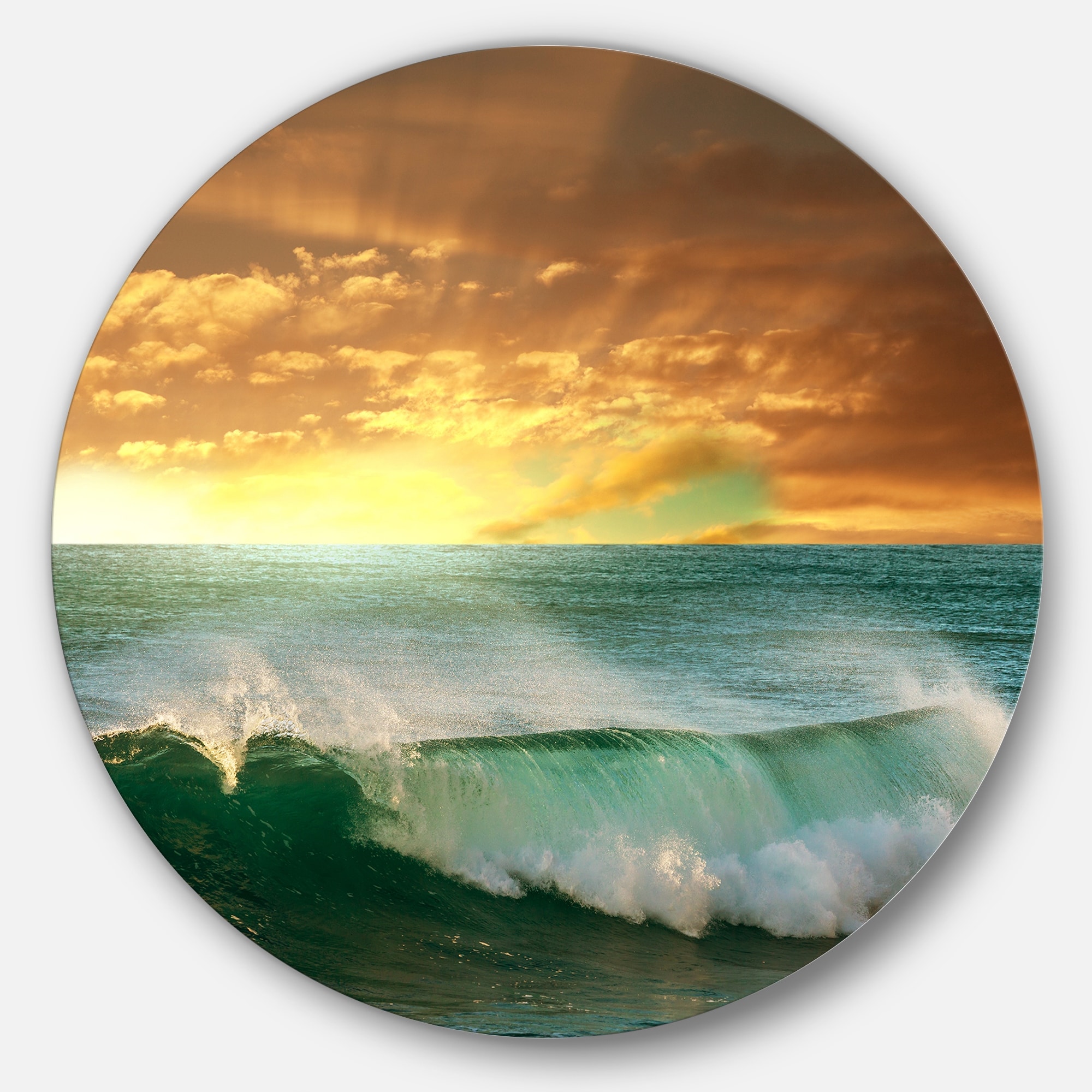 Designart 'Sunrise and Roaring Blue Sea Waves' Beach Disc Metal Wall Art