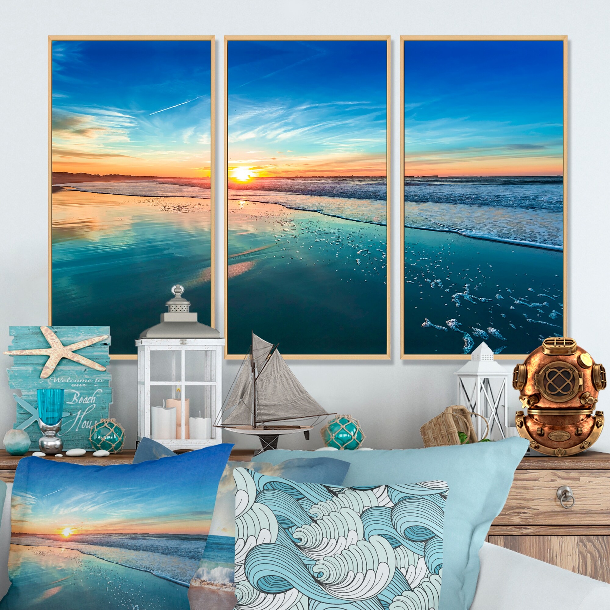 Designart "Blue Seashore with Distant Sunset" Sea & Shore Framed Art Prints Set of 3 - 4 Colors of Frames