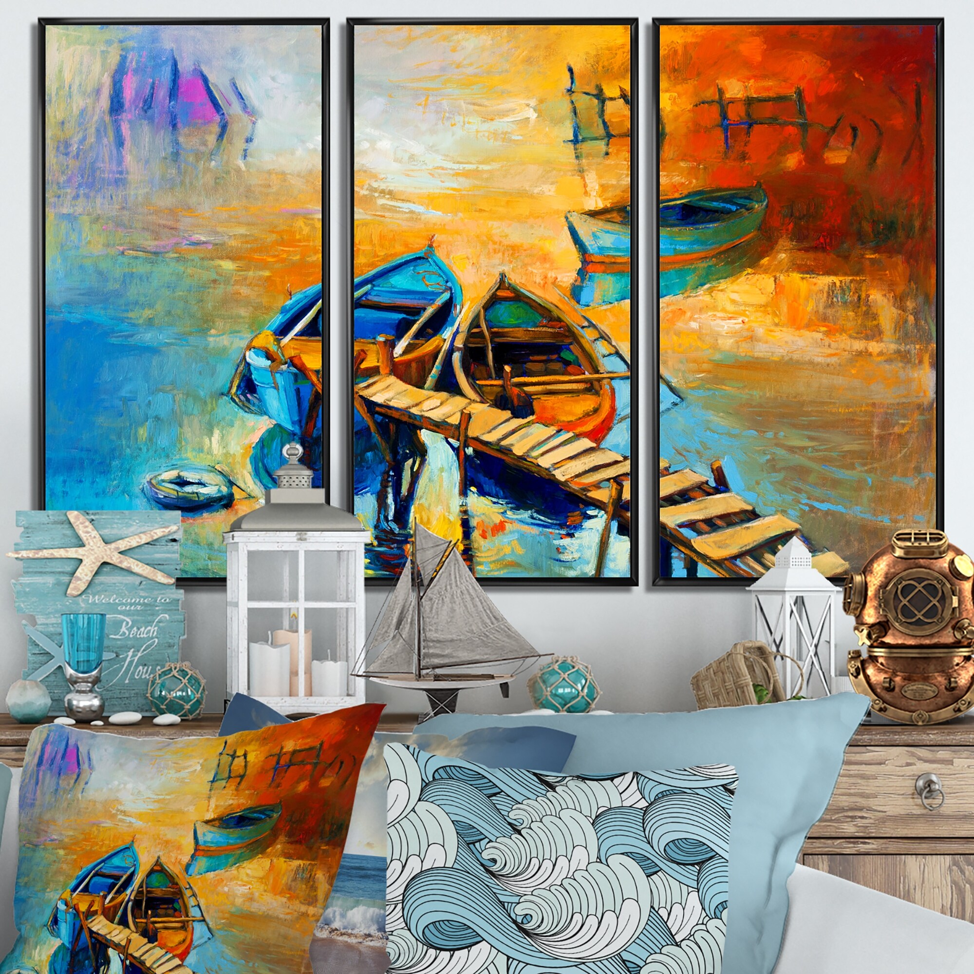 Designart, "Boats Resting on the Water Near Coastal Town I" Nautical & Coastal Framed Canvas Wall Art Print - 3 Panels