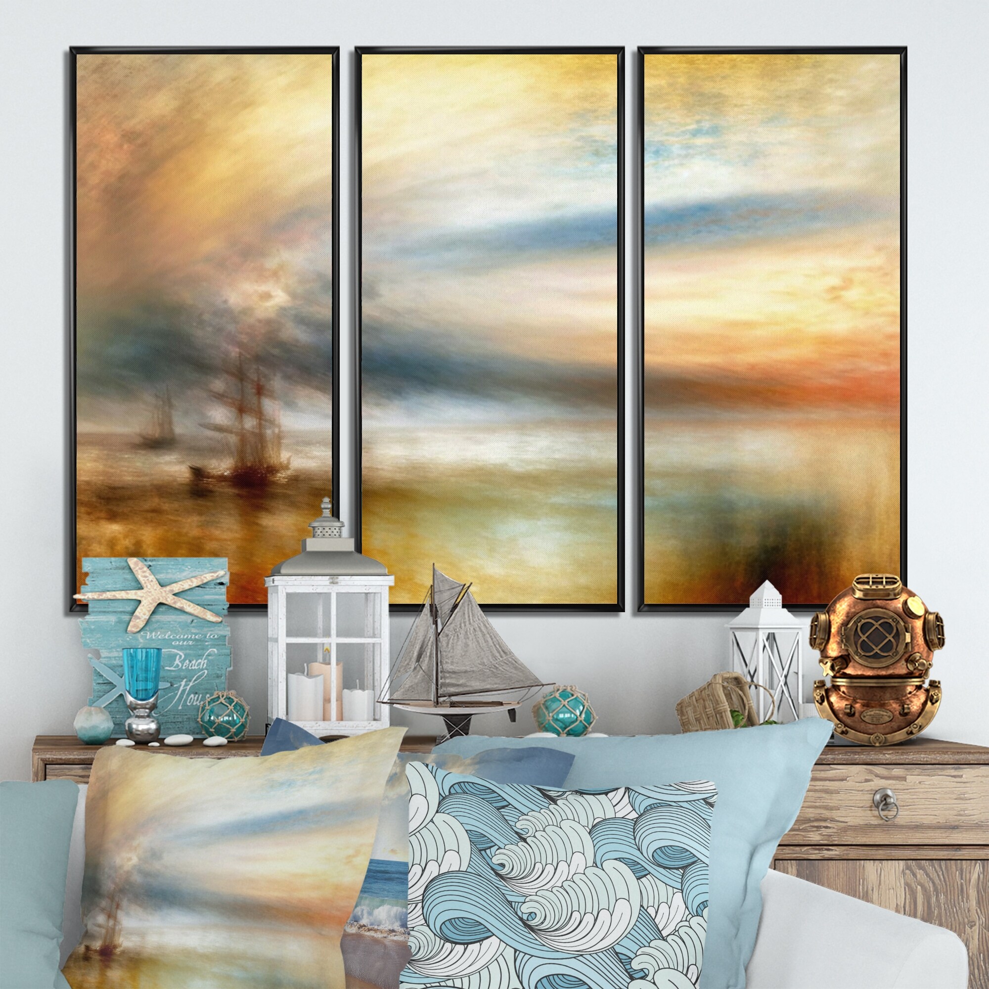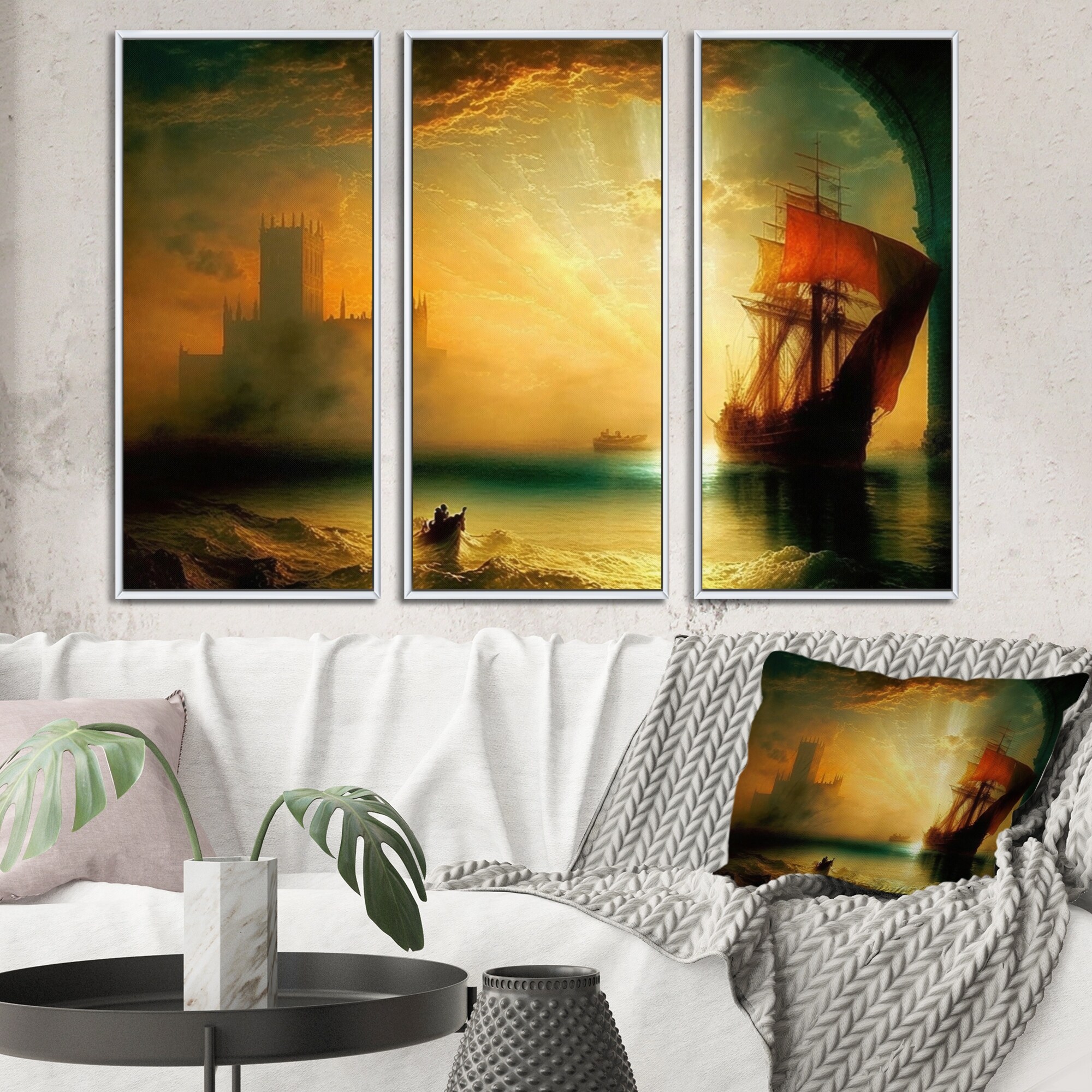 Designart "Sailboat During Exotic Sunset V" Coastal Boat Framed Canvas Wall Art Print - 3 Panels