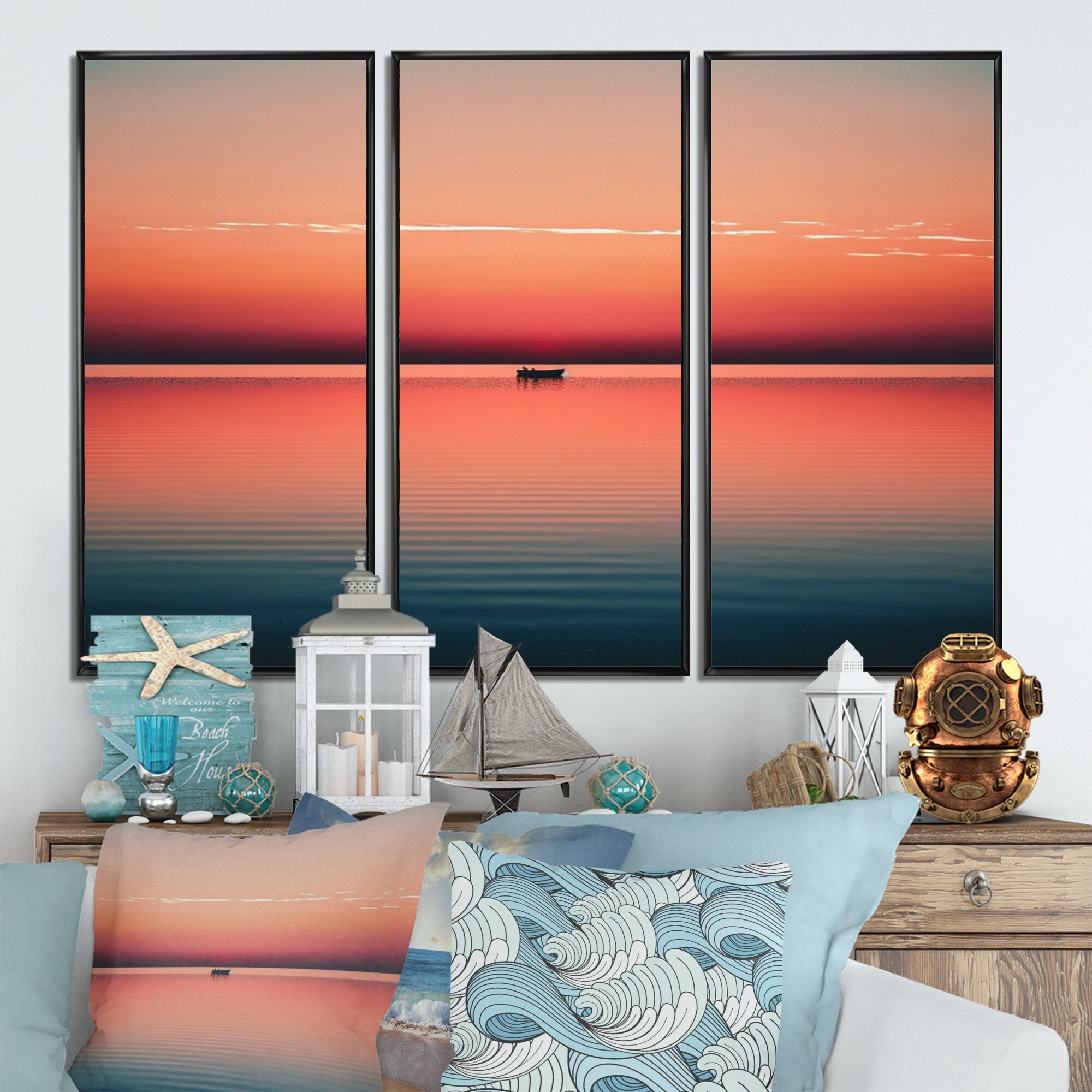 Designart "Minimalistic Sunset During the Full Moon IV" Coastal Boat Framed Canvas Wall Art Print - 3 Panels