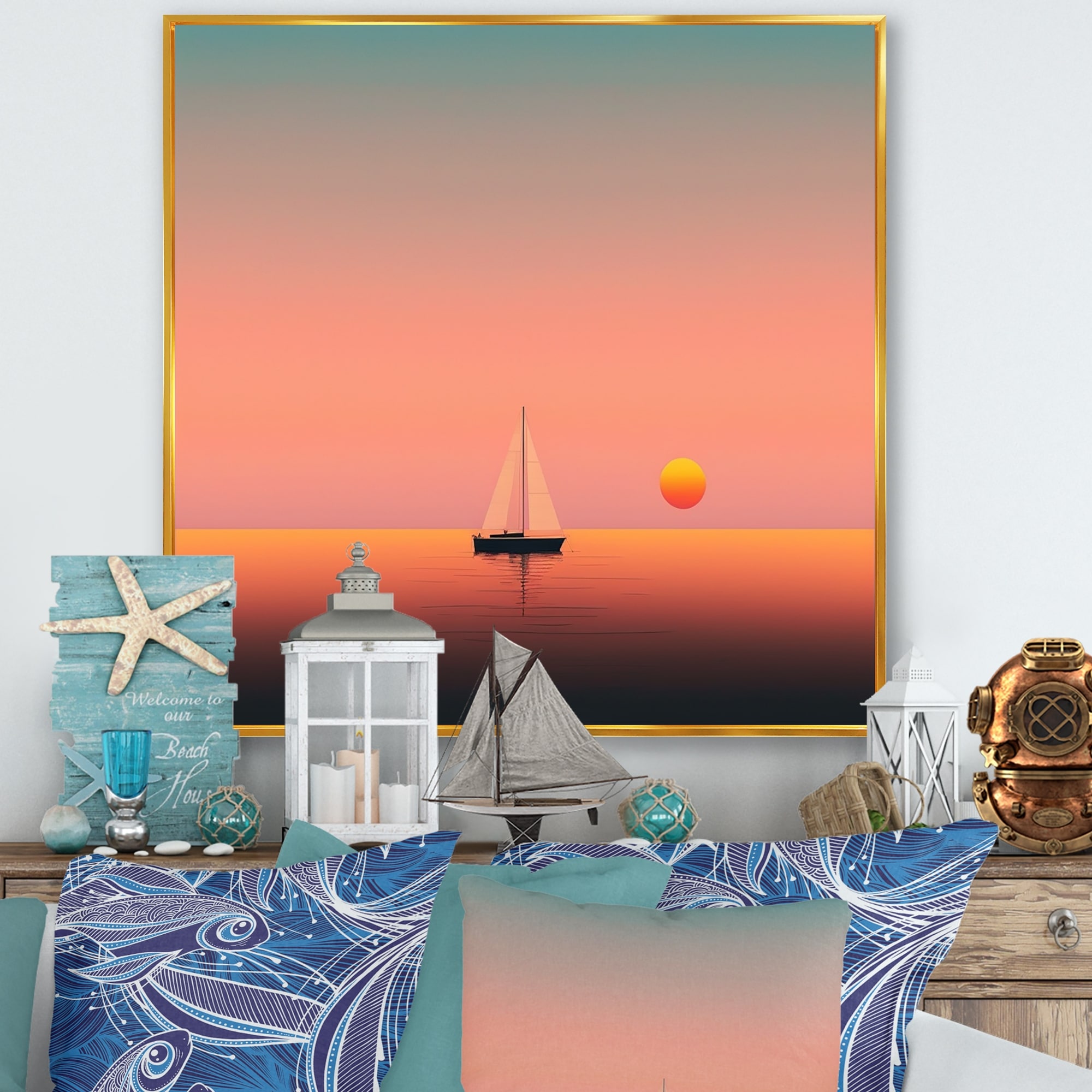 Designart "Minimalistic Sunset During the Full Moon I" Coastal Boat Framed Canvas Wall Art Print