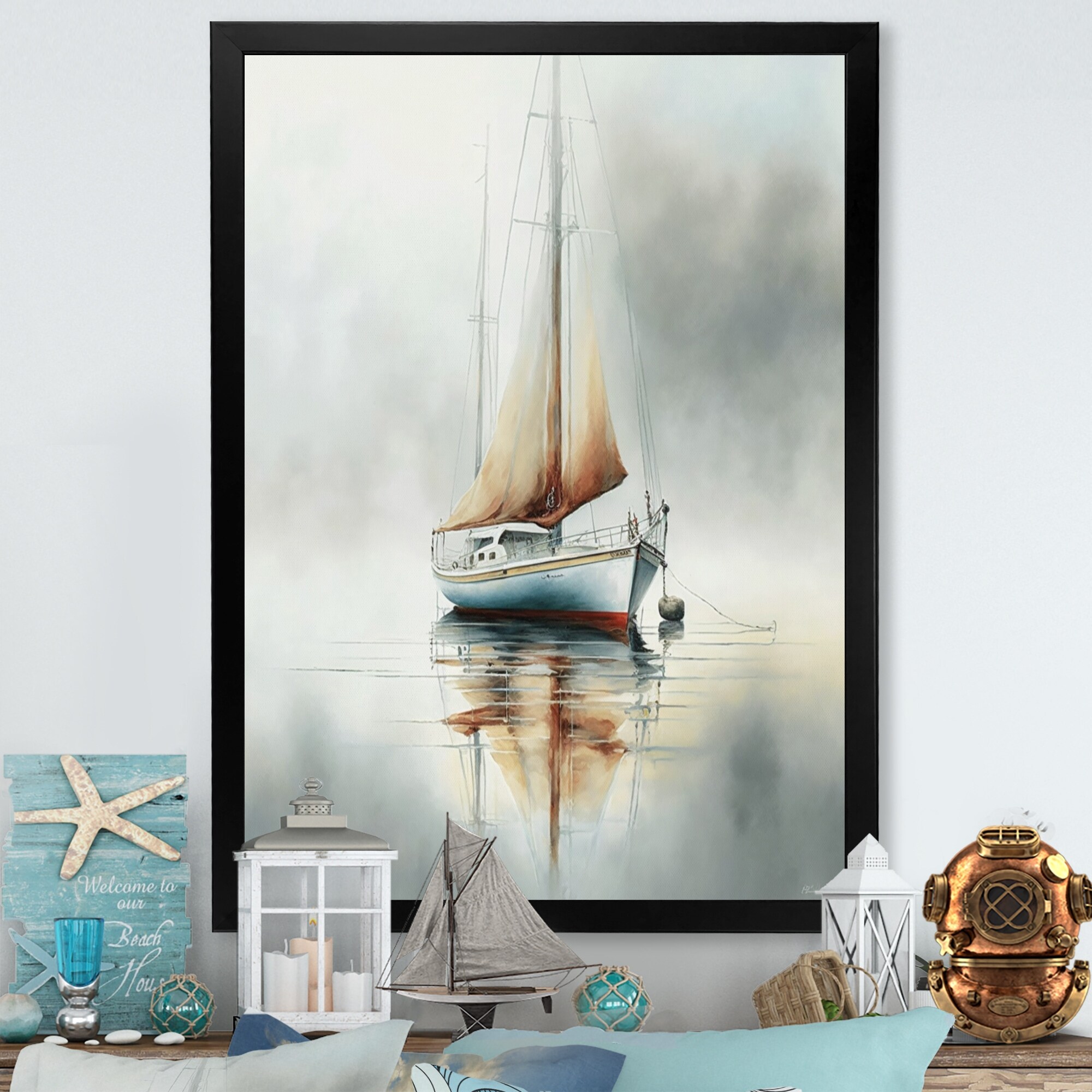 Designart "Yellow Fog Boat on Lake Iii" Coastal Boat Framed Wall Art Prints