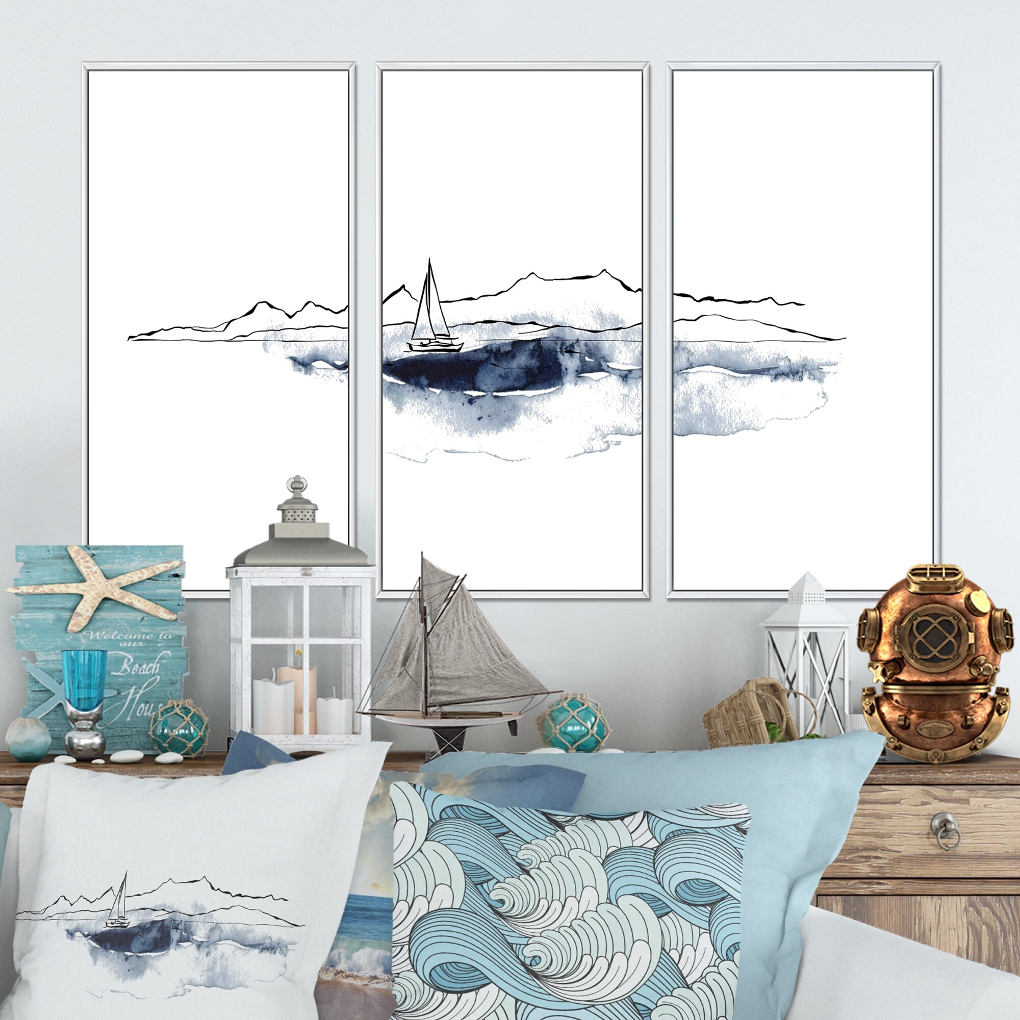 Designart "Minimalistic Seascape With Black Mountains & Boat" Nautical & Coastal Framed Wall Decor Set of 3 - 4 Colors of Frames