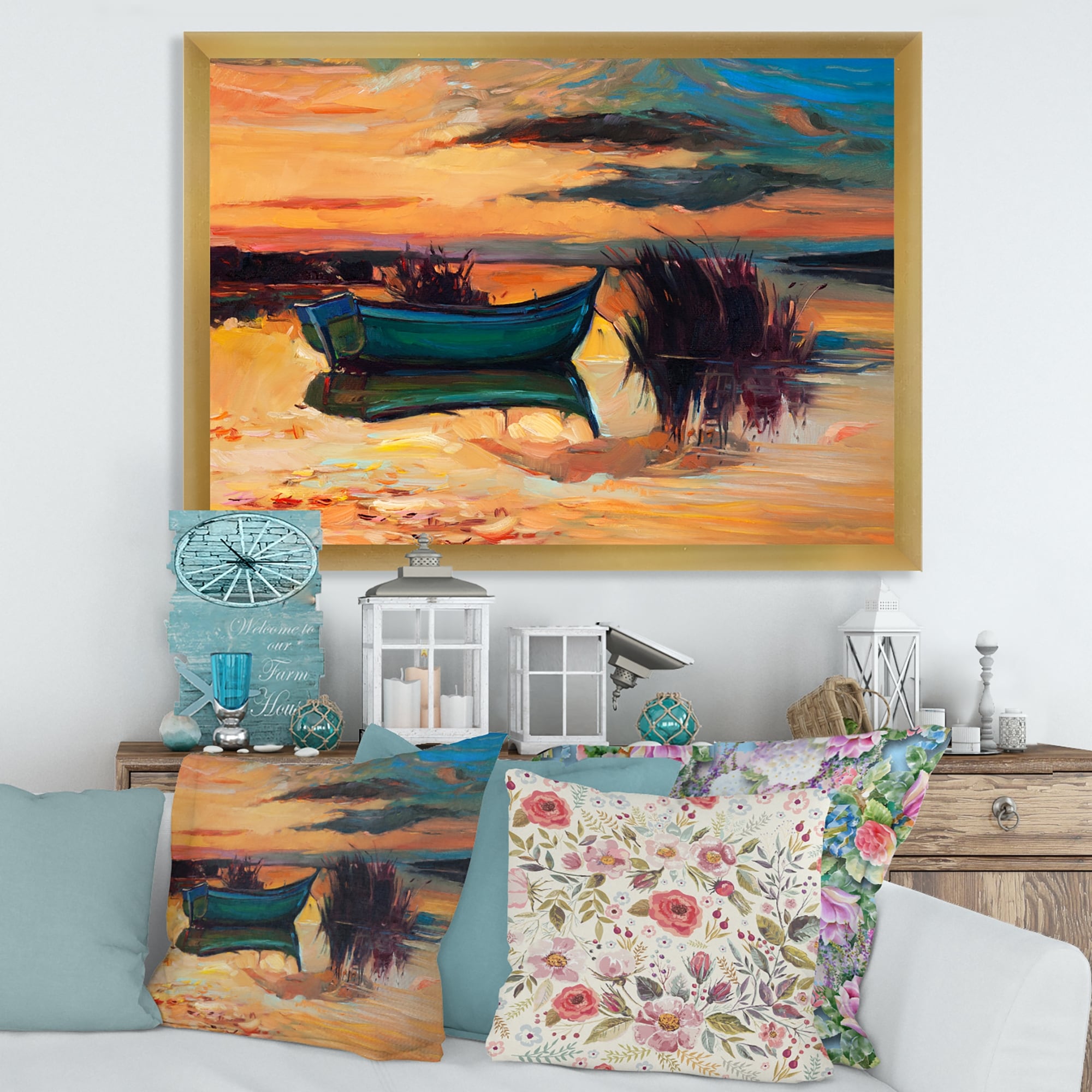 Designart "Little Boats Arriving the At Shore During Sunset VIII" Traditional Framed Canvas Wall Art Print