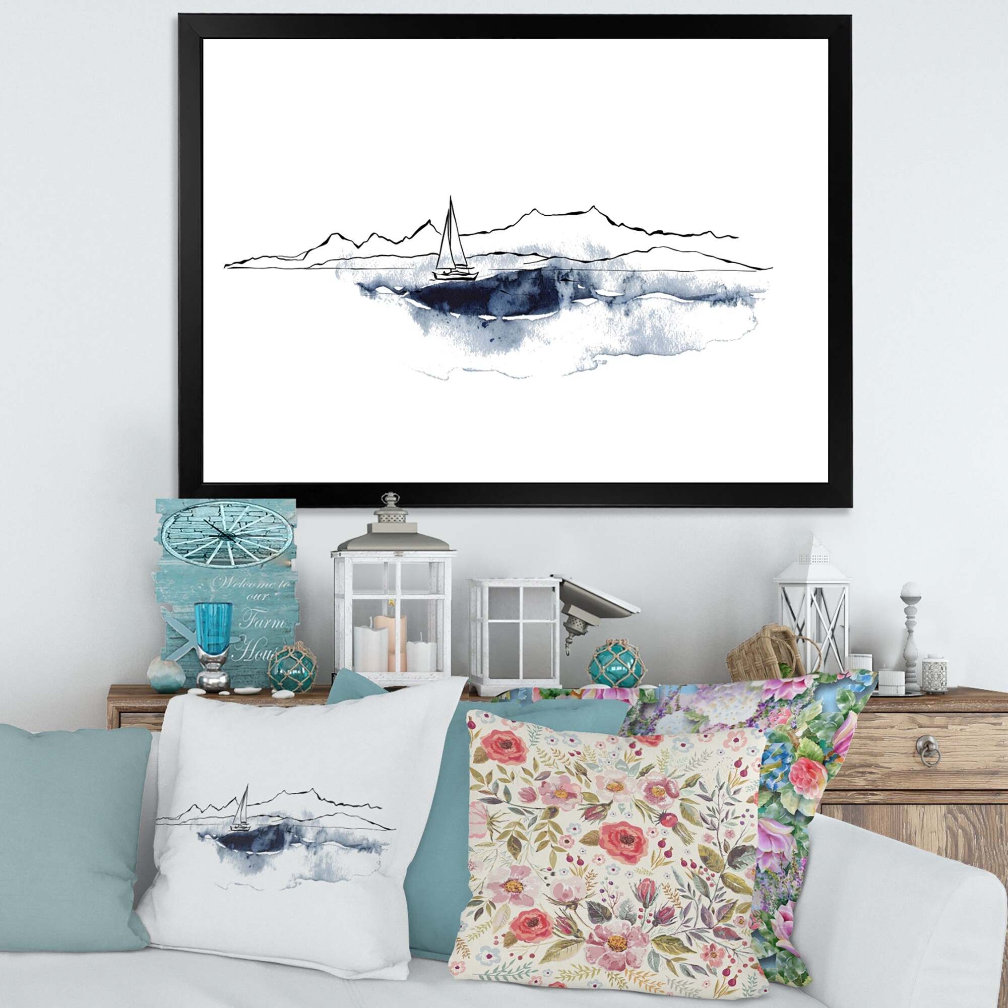 Designart "Minimalistic Seascape With Black Mountains & Boat" Nautical & Coastal Framed Art Print