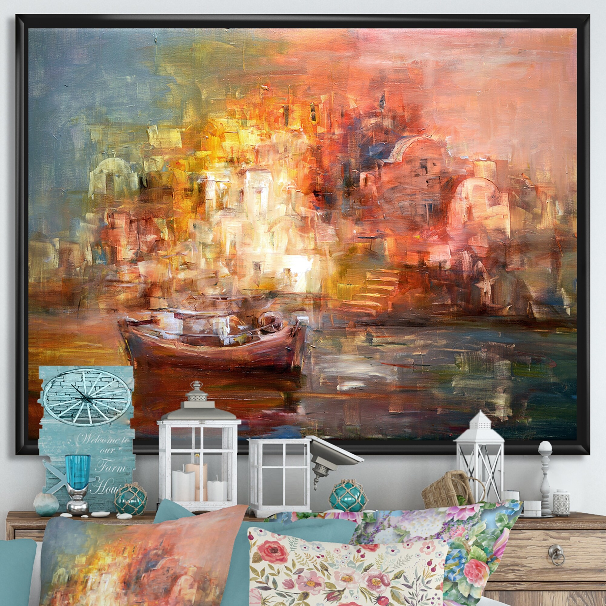 Designart "Boats Resting on the Water Near Coastal Town IV" Nautical & Coastal Framed Art Print