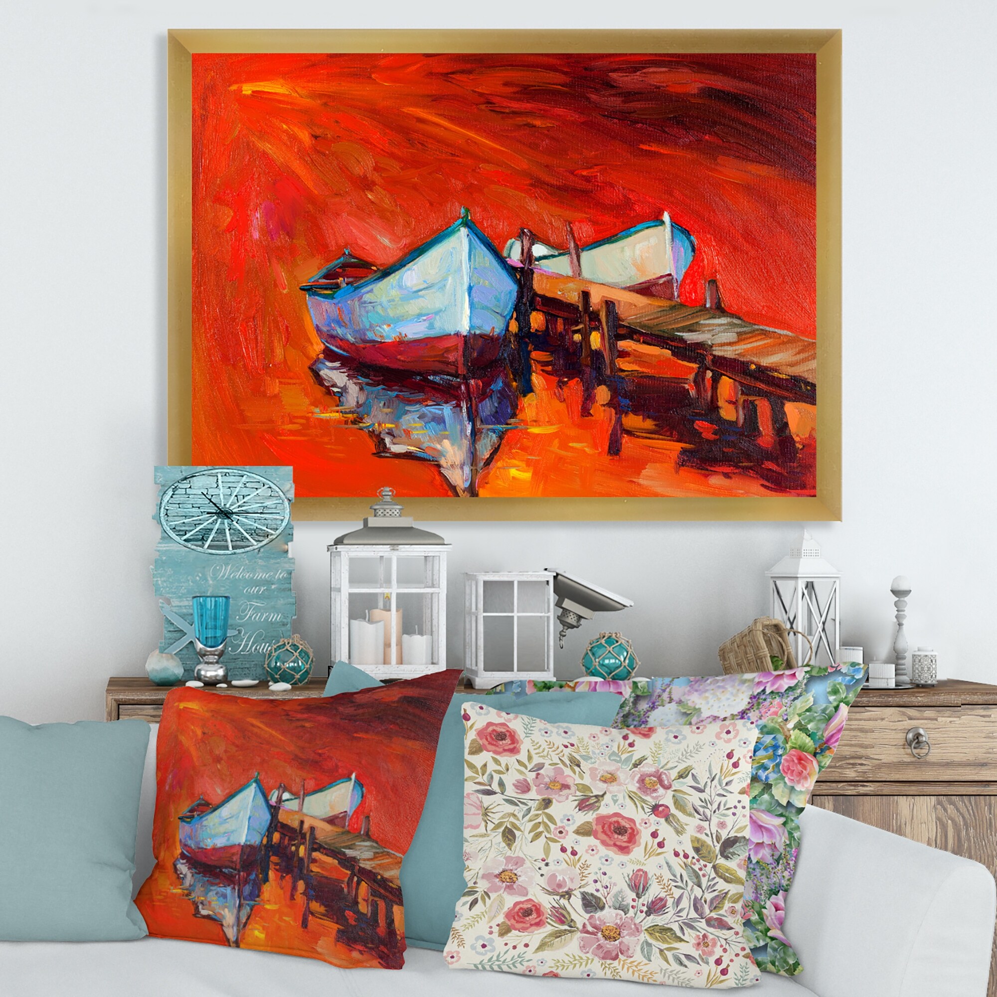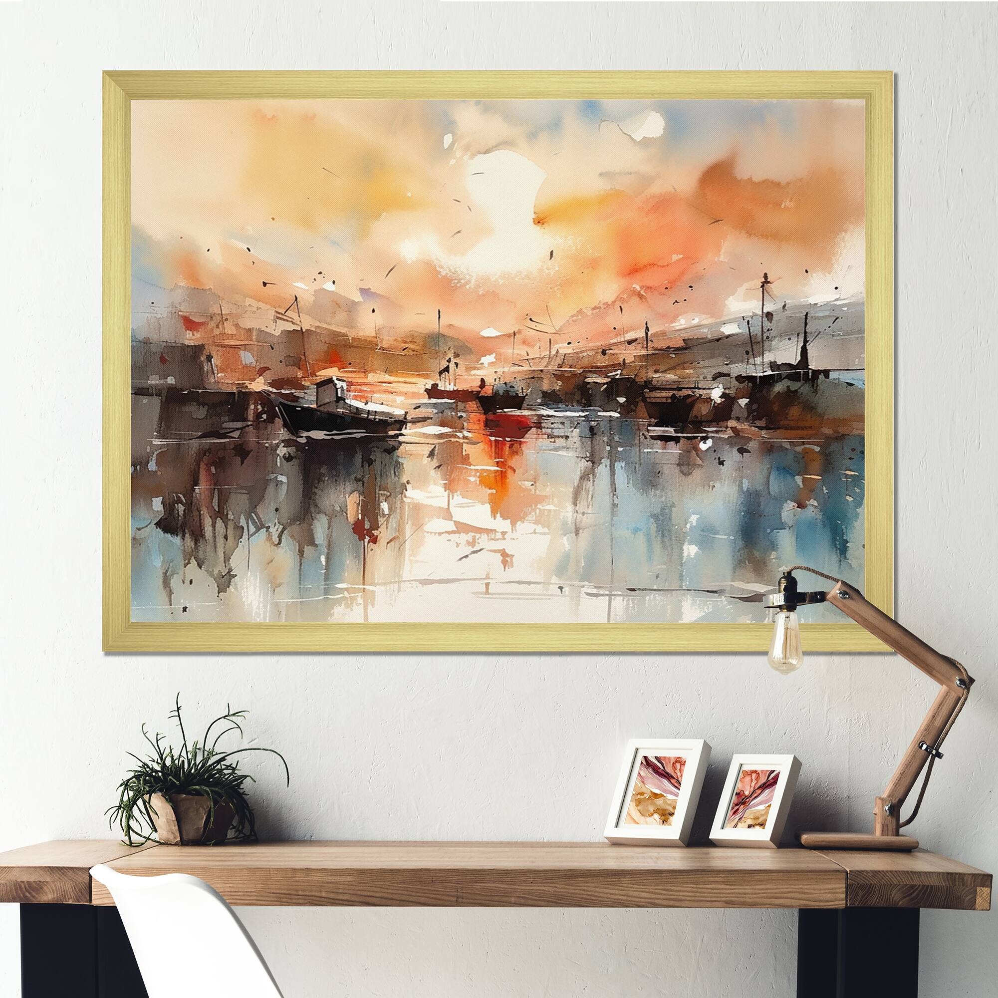 Designart "Orange And Brown Harbor Reflections" Coastal Boat Framed Canvas Art Print