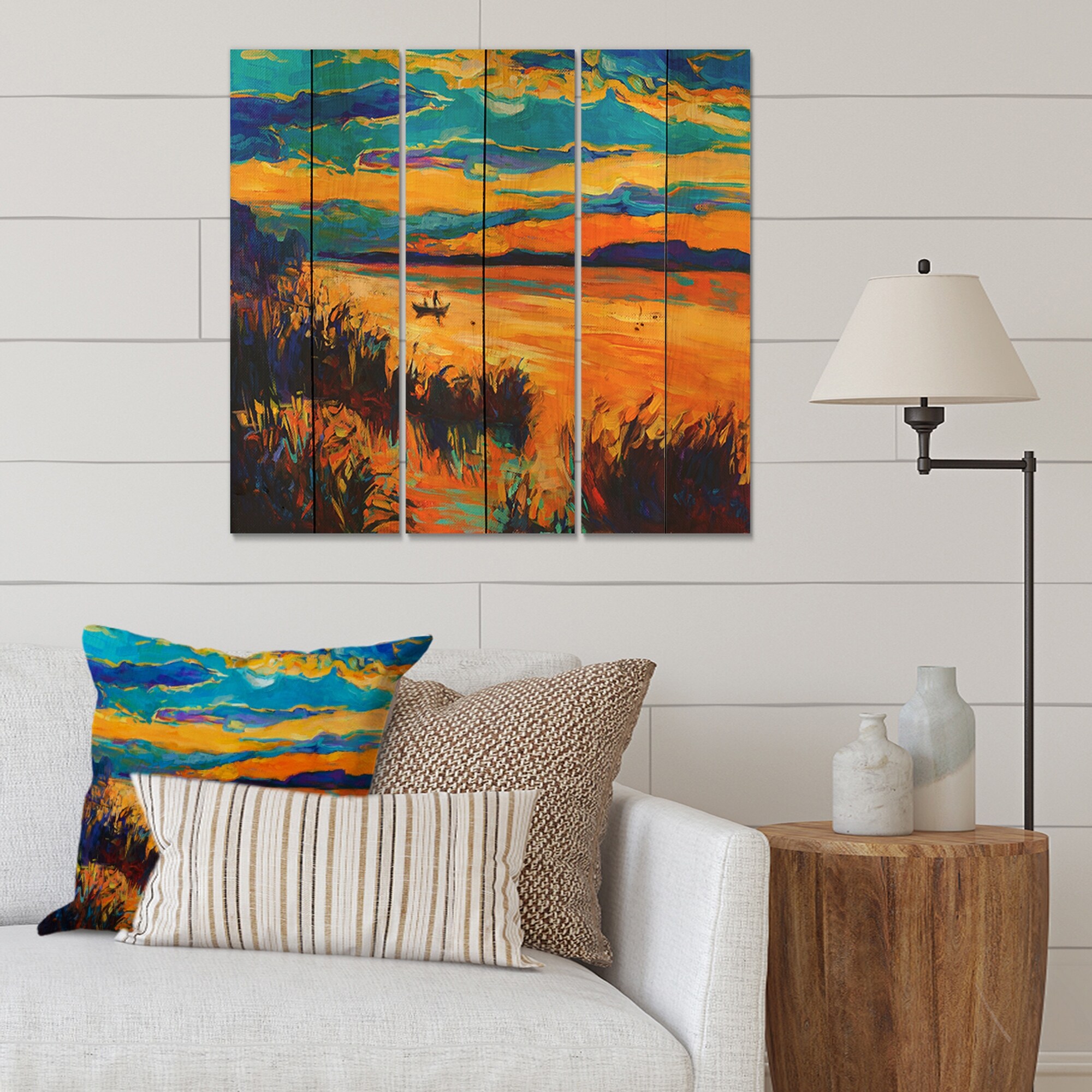Designart 'Little Boat At the Horizon of a Lake During Sunset' Nautical & Coastal Print on Natural Pine Wood - 3 Panels