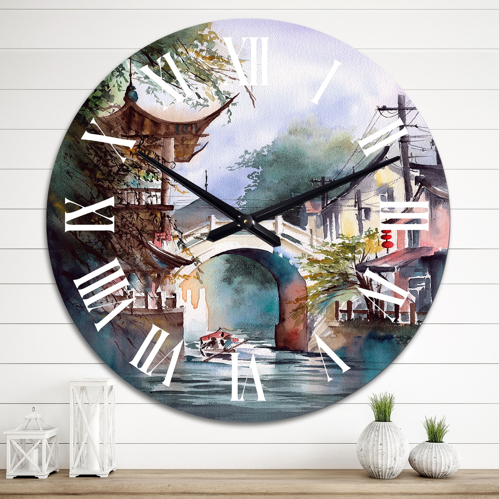 Designart 'A Chinese Cityscape With A Boat on the River' Mid-Century Modern wall clock