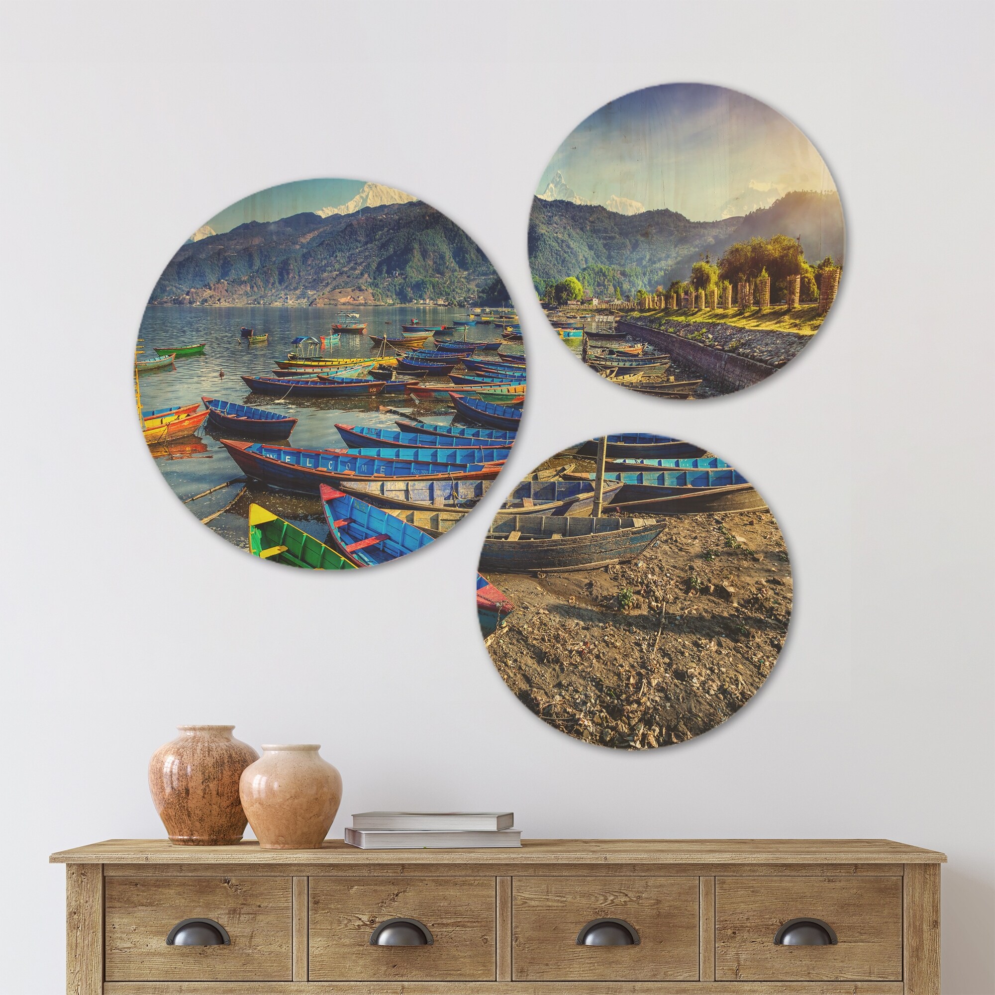 Designart 'Colorful Boats in Pokhara Lake' Boat Wood Wall Art Set of 3 Circles - Multi-Color