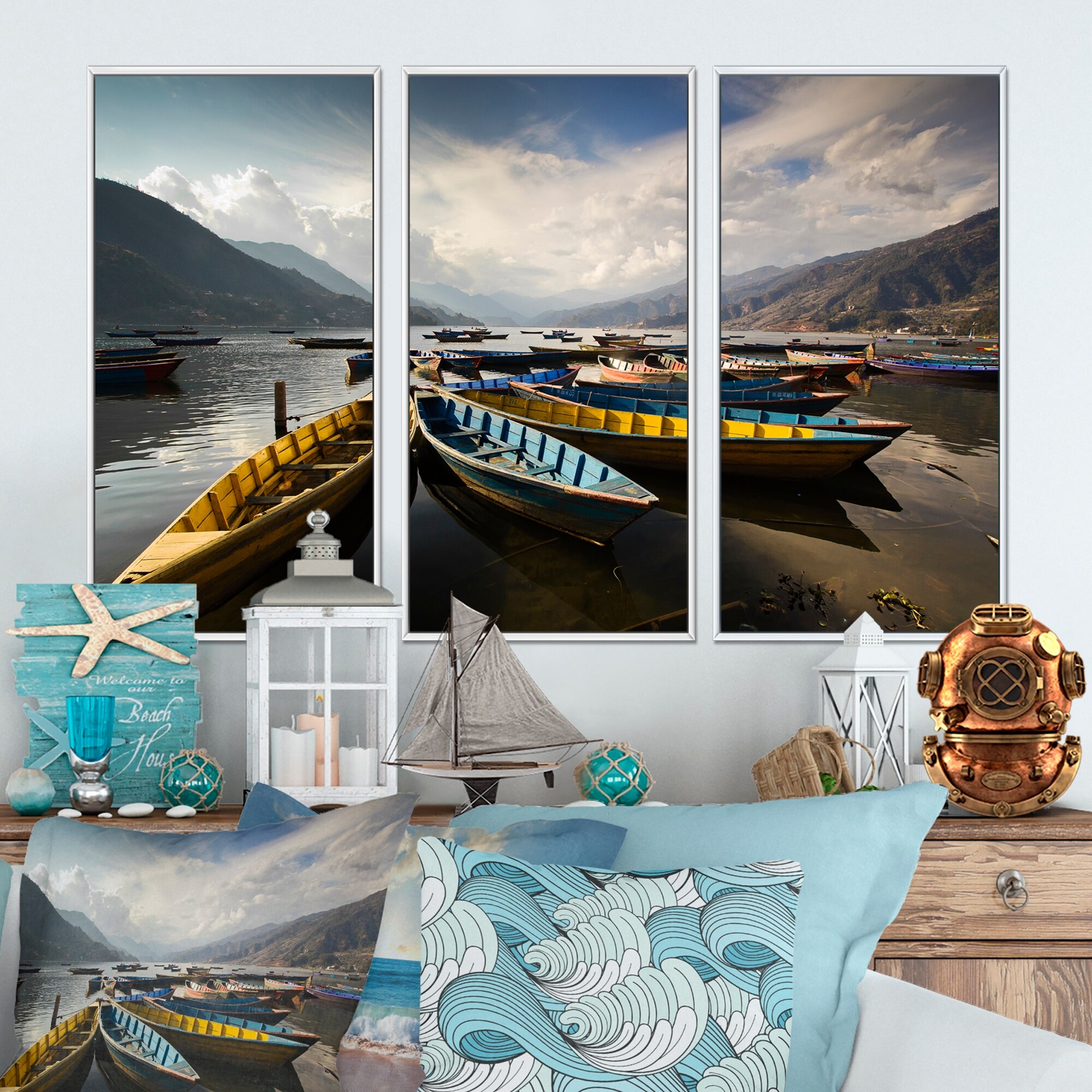 Designart "Pokhara Lakeside Boats" Boats Framed Canvas Wall Art Set of 3 - 4 Colors of Frames
