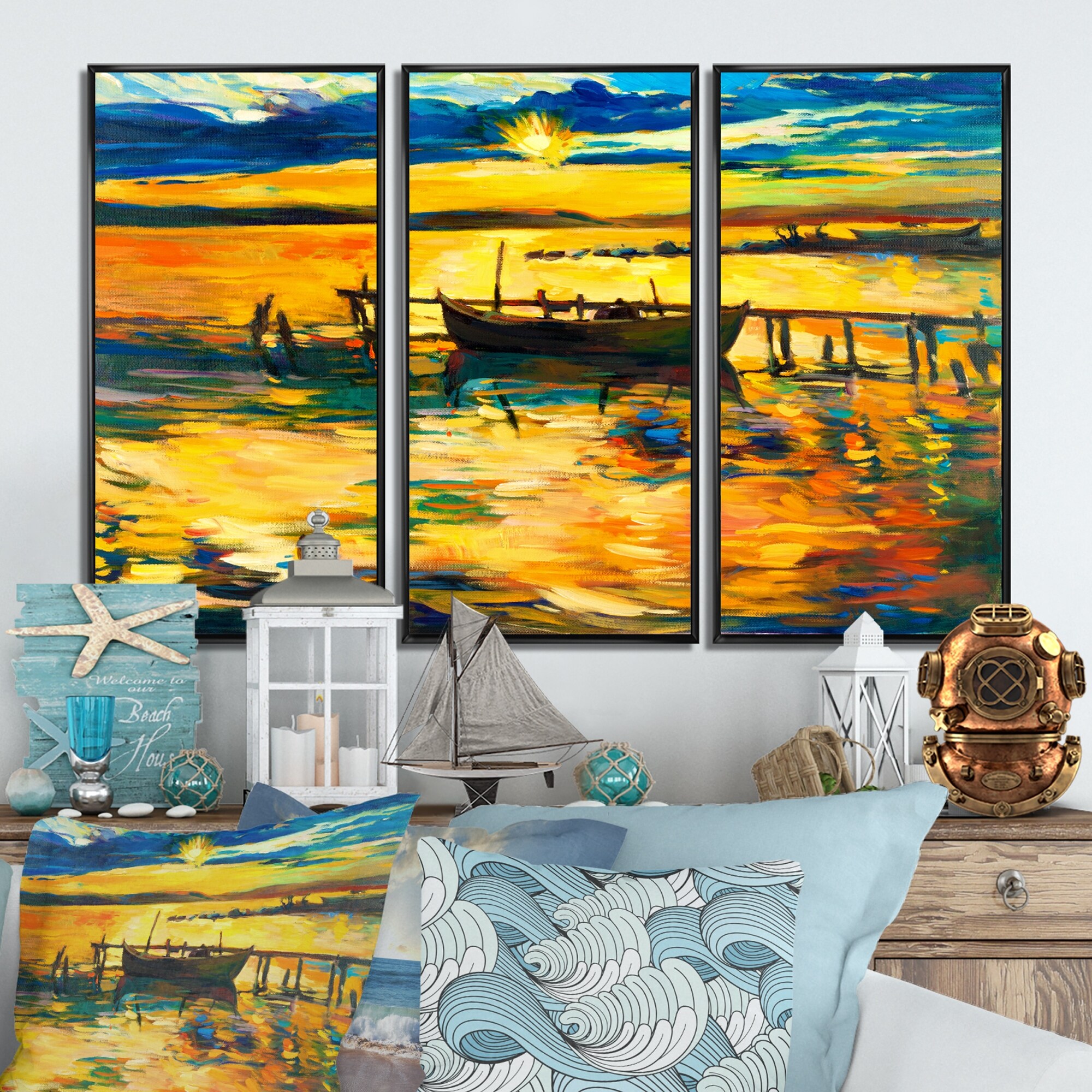 Designart "Boat During Evening Glow At the Lake VI" Nautical & Coastal Framed Wall Art Set of 3 - 4 Colors of Frames