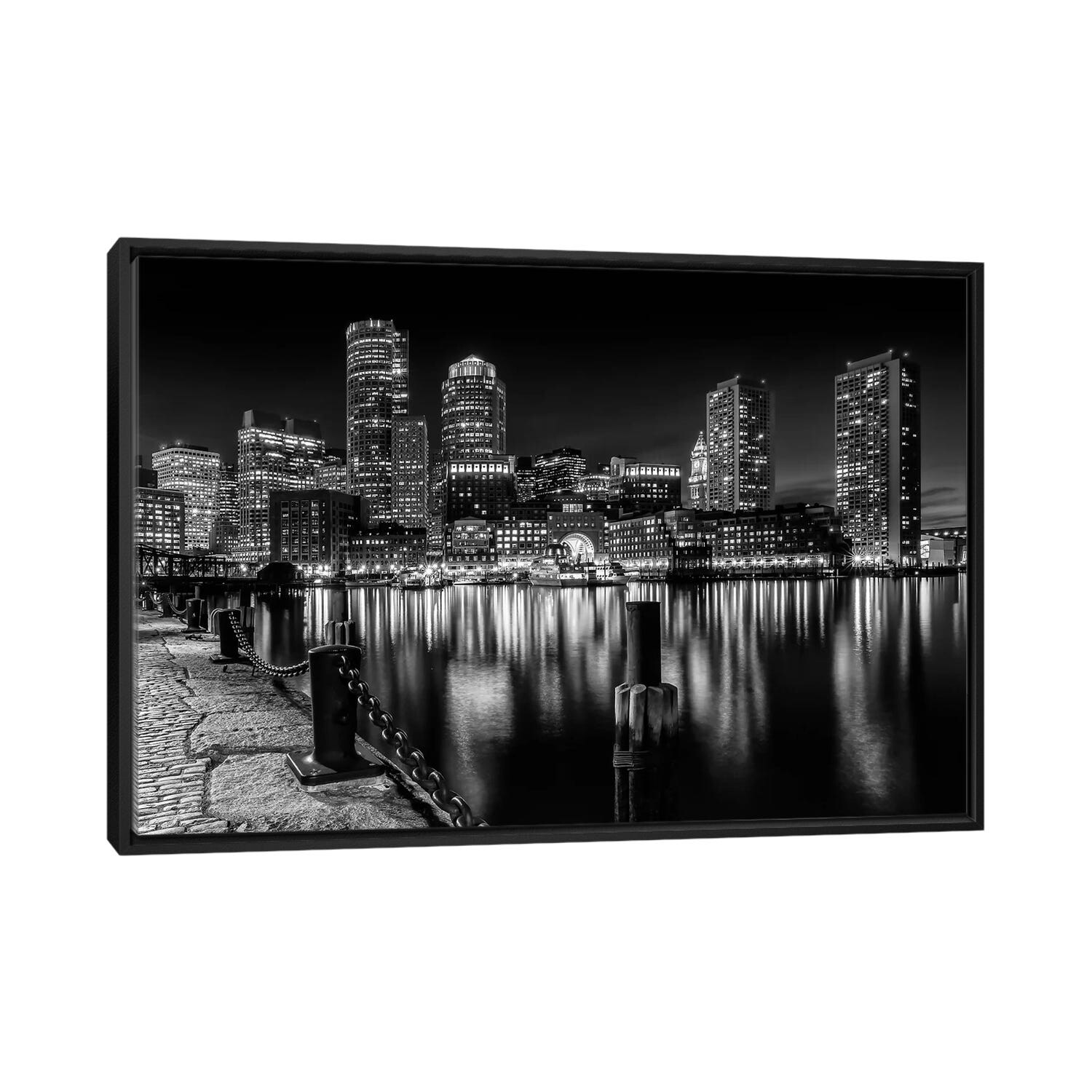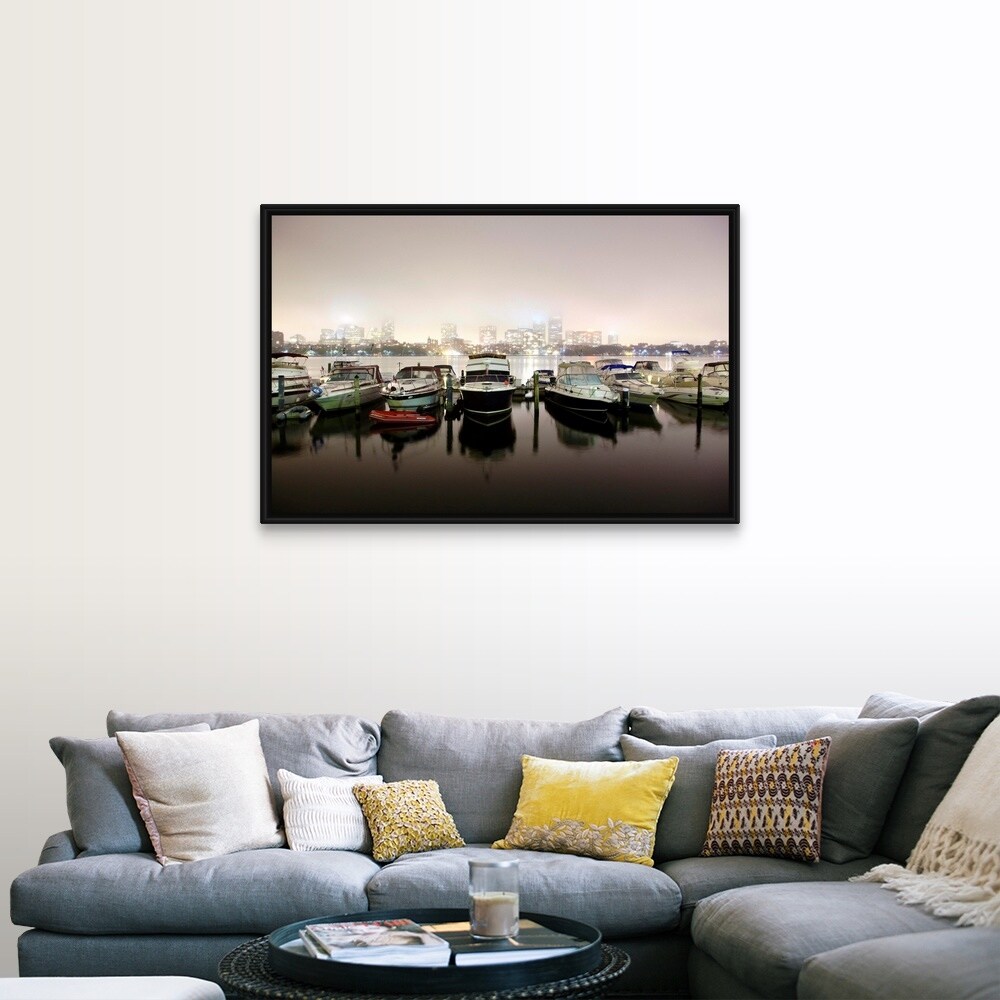 "Boats in Boston Harbor at Night" Black Float Frame Canvas Art