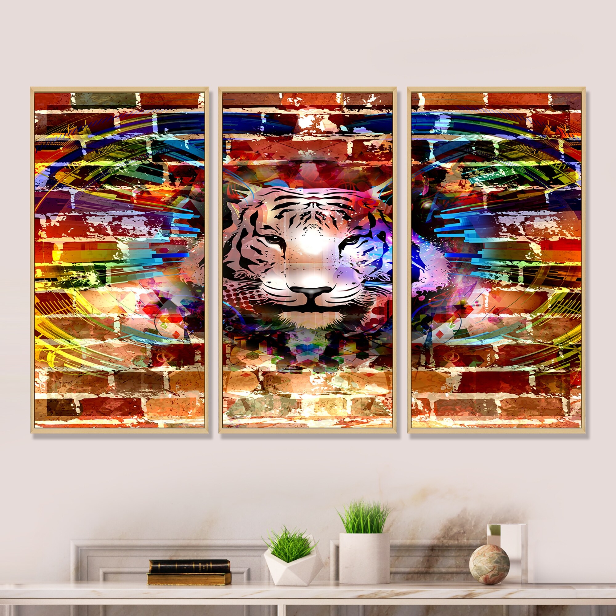 Designart "Tiger over Abstract Brick Design" Abstract Framed Artwork Set of 3 - 4 Colors of Frames