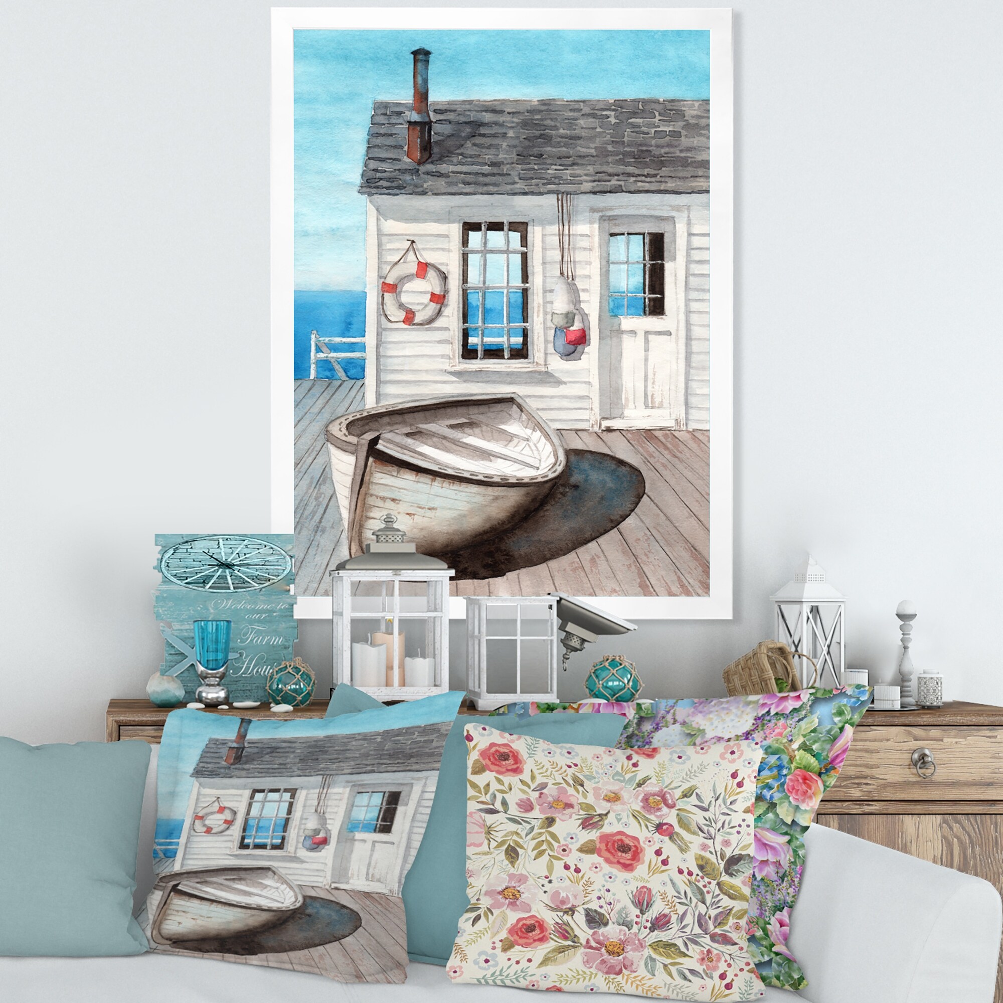 Designart "White Beach Cabin on Wood Pier" Nautical & Coastal Framed Art Print