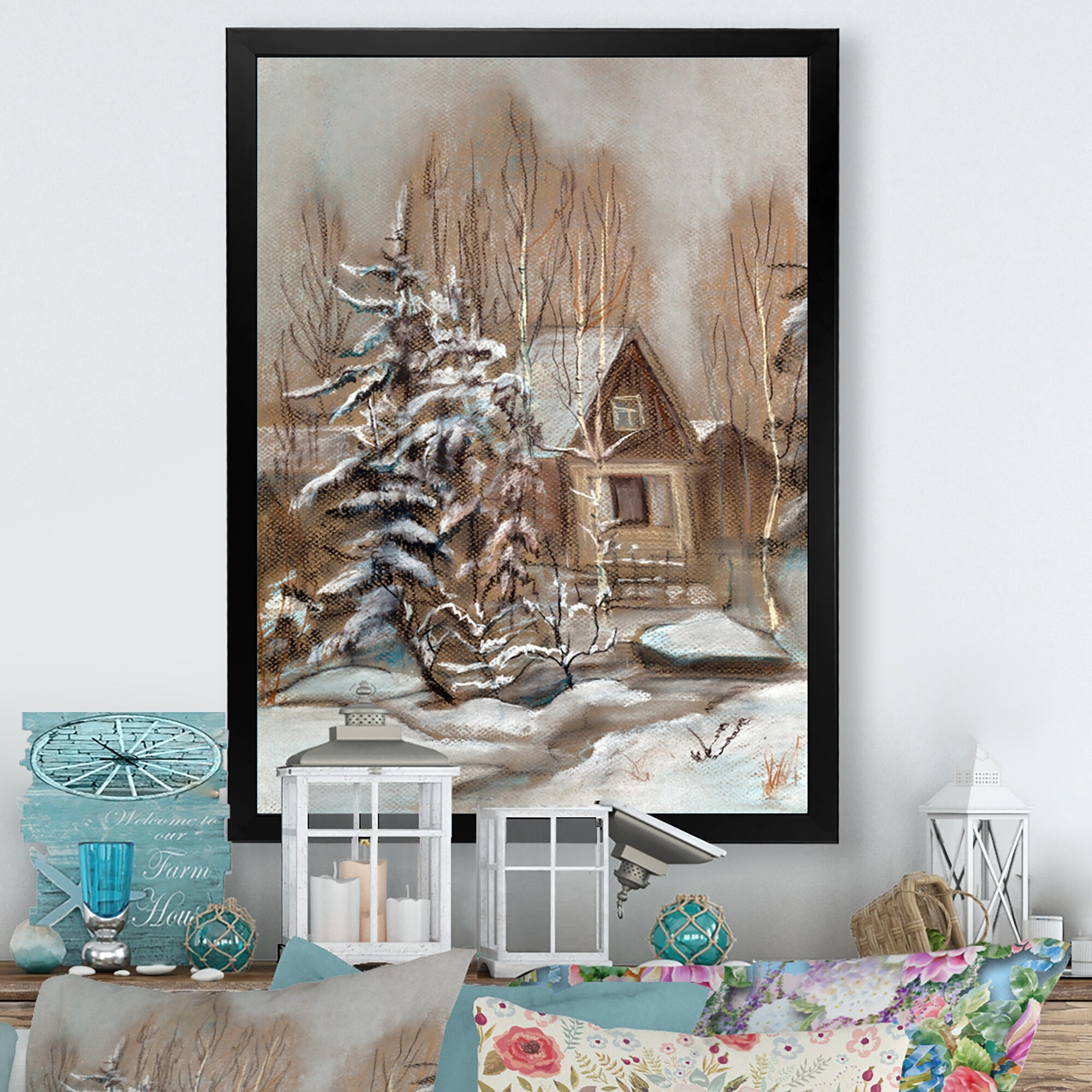 Designart "Grey And White Cozy Snow Cabin" Countryside Framed Canvas Wall Art