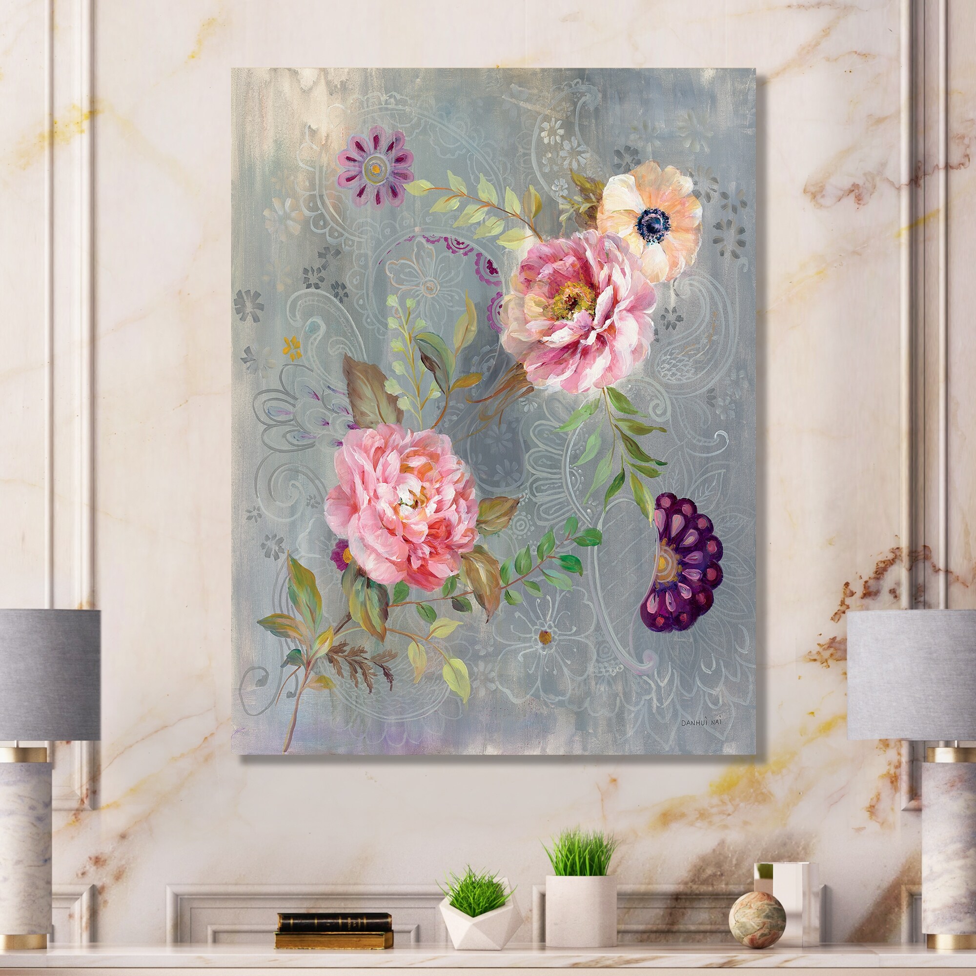 Designart "Peonies and Paisley" Cabin & Lodge Canvas Art - Grey