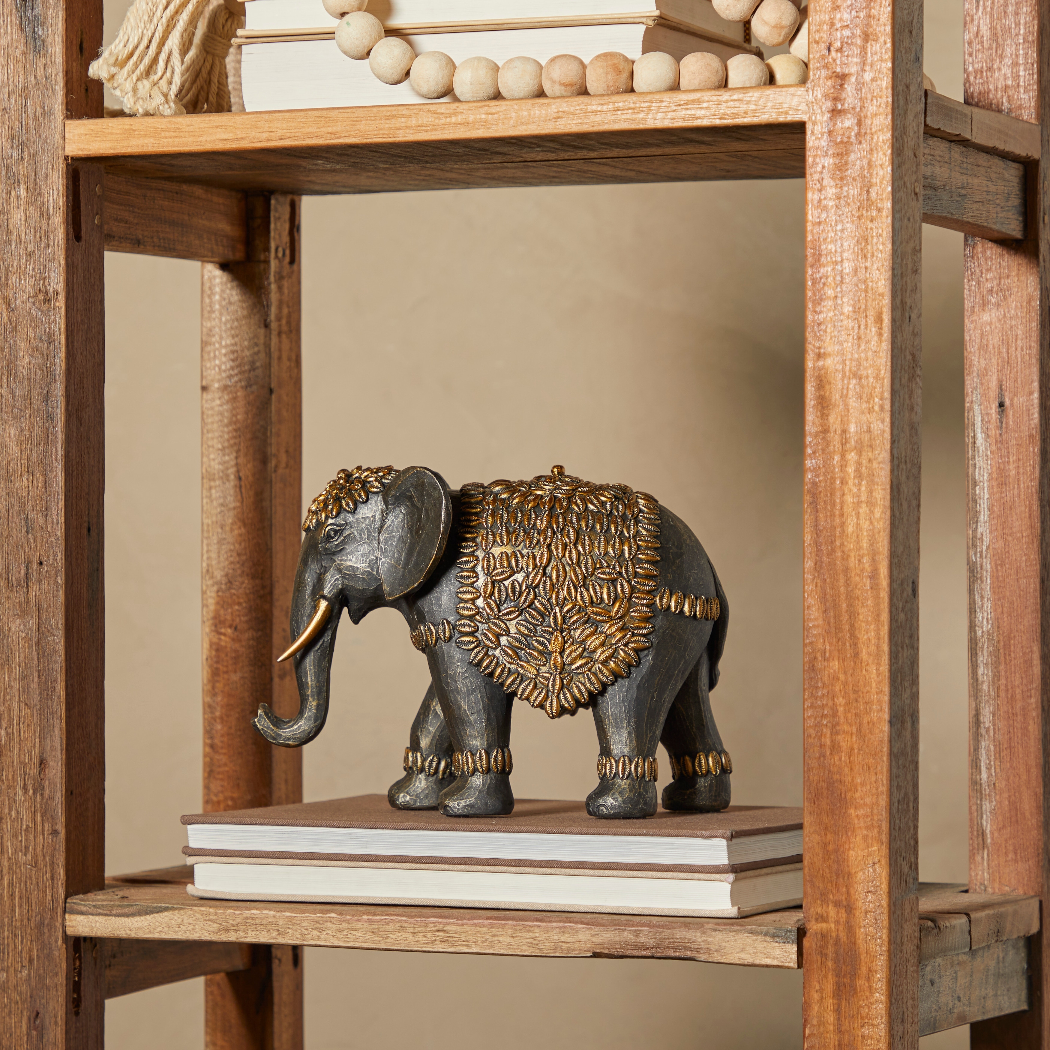 Black Polystone Elephant Sculpture with Cowrie Shell Carvings
