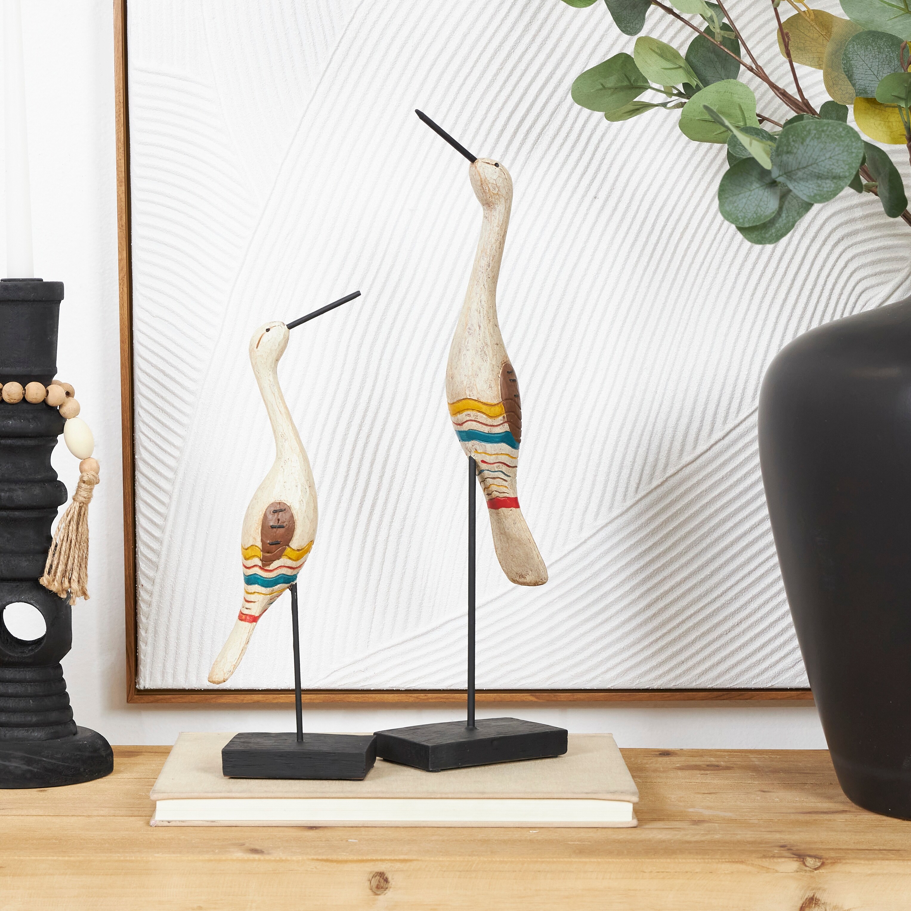 Cream Polystone Handmade Distressed Carved Bird Sculpture with Colorful Patterns and Black Stand (Set of 2)