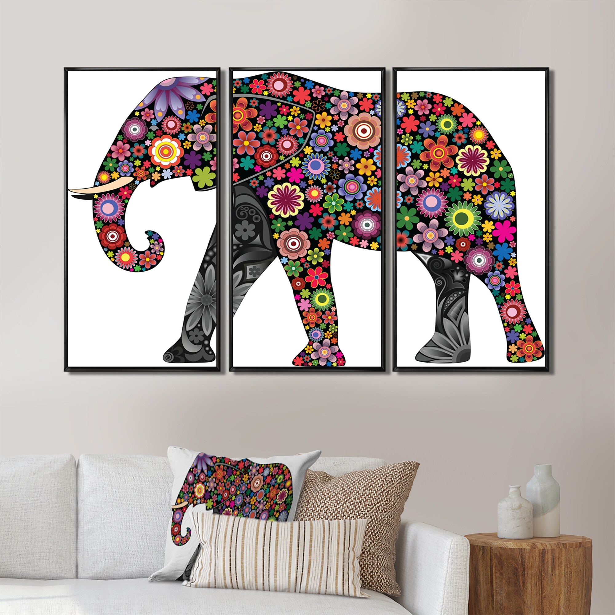 Designart "Cheerful Elephant" Animal Framed Canvas Wall Art Set of 3 - 4 Colors of Frames