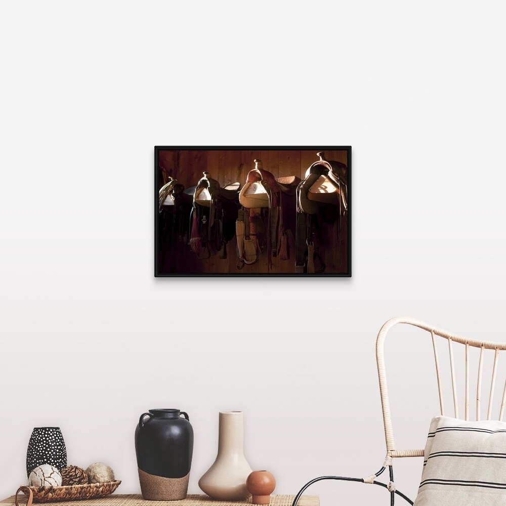 "Saddles in barn, Colorado" Black Float Frame Canvas Art