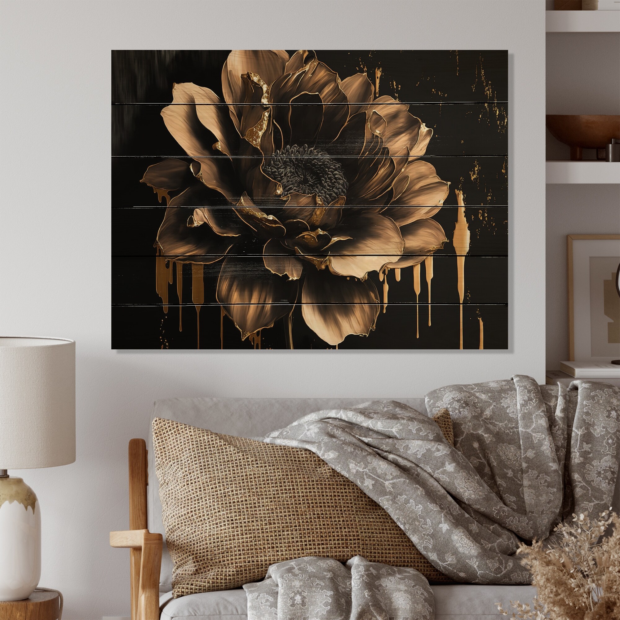 Designart 'Black And Gold Dahlia'Floral Dahlia Wood Wall Art - Natural Pine Wood