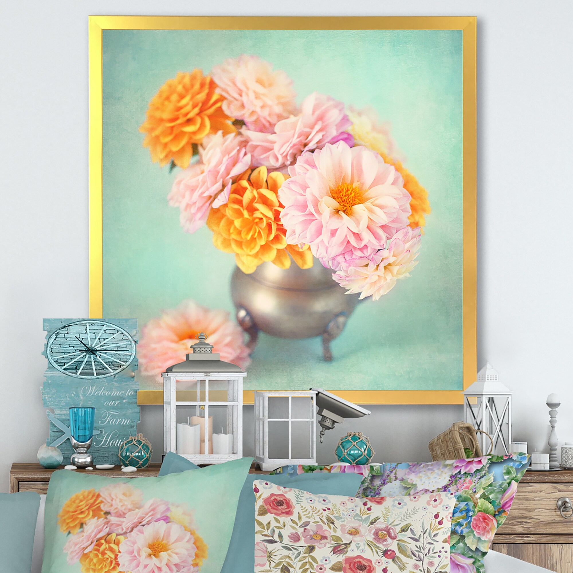 Designart "Vintage Bouquet of Pink And Yellow Dahlias" Traditional Framed artwork