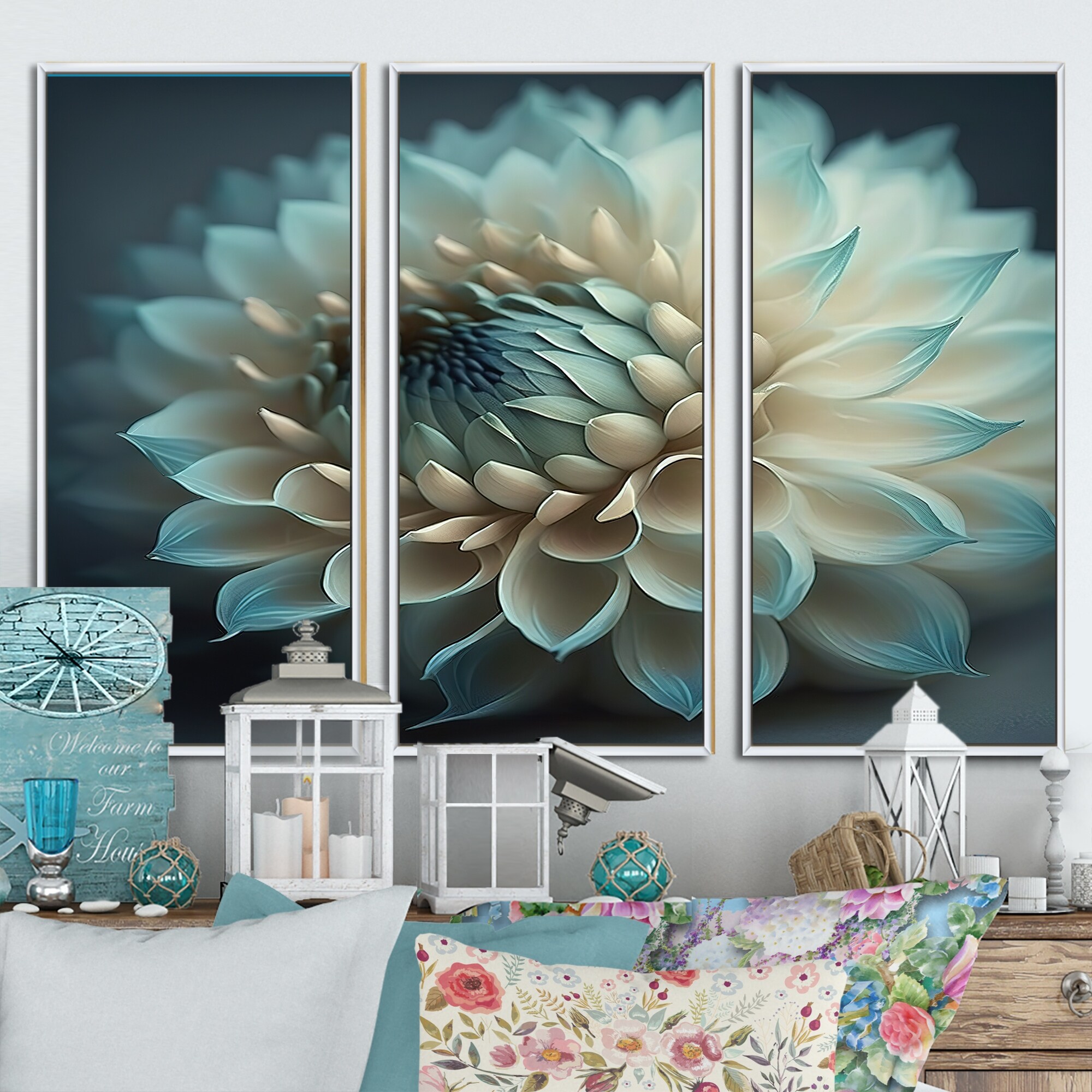 Designart "Blue And White Dahlia Flowers V" Floral Dahlia Framed Canvas Art Print - 3 Panels