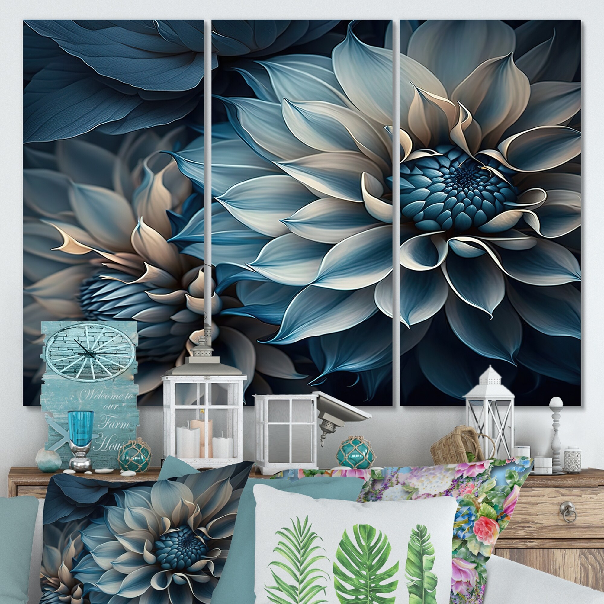 Designart "Dahlia Flowers Blue And White II" Floral Dahlia Canvas Art Print - 3 Panels