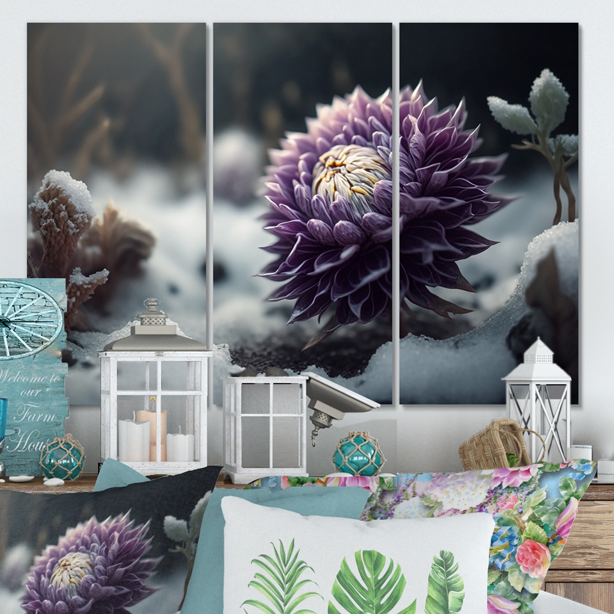 Designart "A Blooming Purple Dahlia Flower in Winter I" Floral Peony Canvas Art Print - 3 Panels