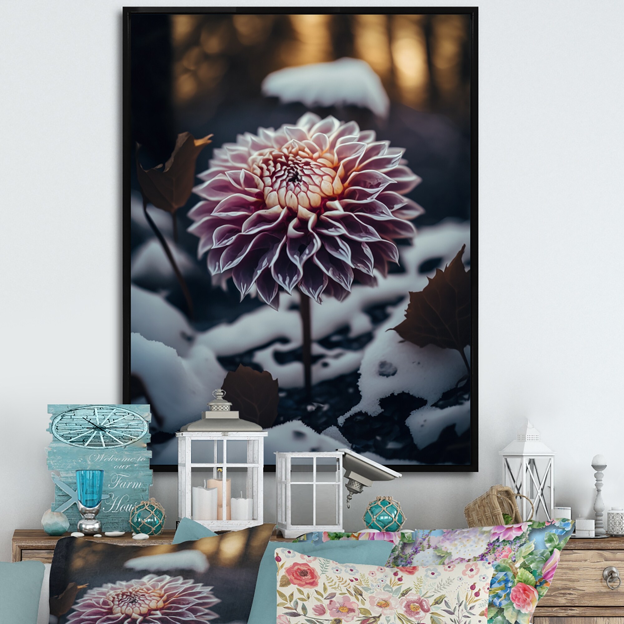 Designart "A Blooming Purple Dahlia Flower in Winter IV" Floral & Botanical Framed Canvas Art Print