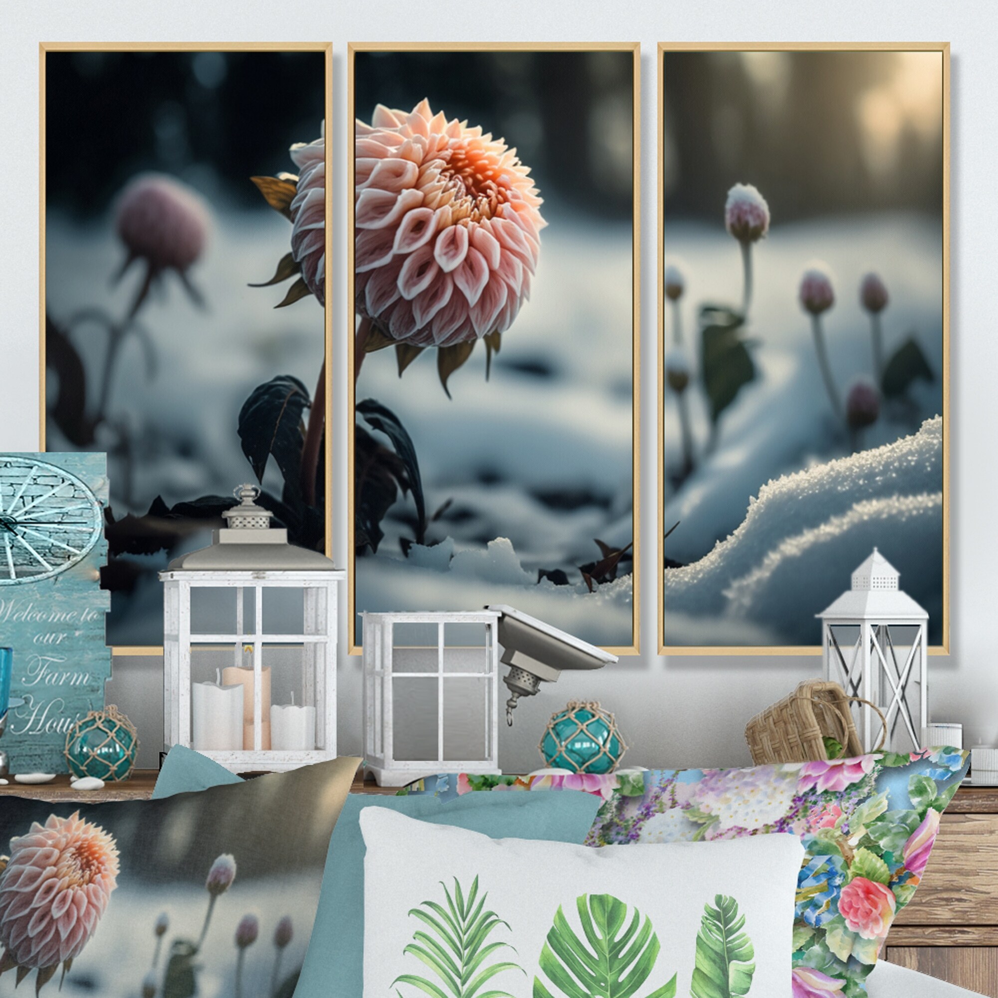 Designart "A Blooming Pink Dahlia Flower in Winter I" Floral Dahlia Framed Canvas Art Print - 3 Panels