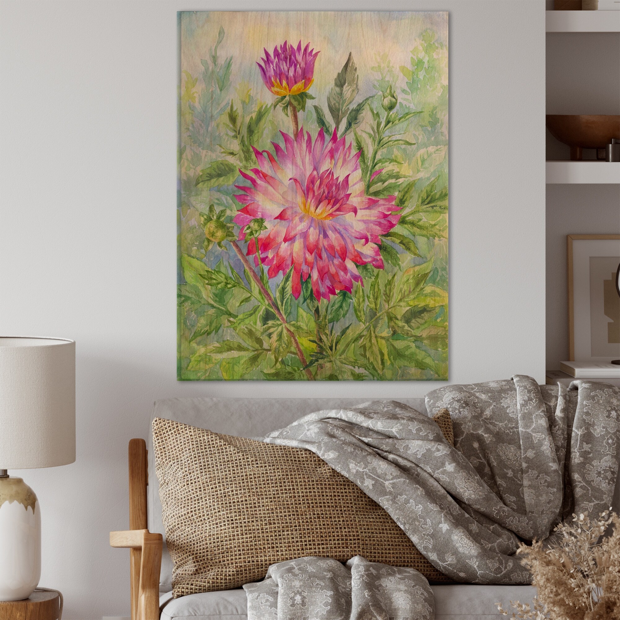 Designart 'Dahlia In Flowering Garden' Traditional Wood Wall Art Panels - Natural Pine Wood