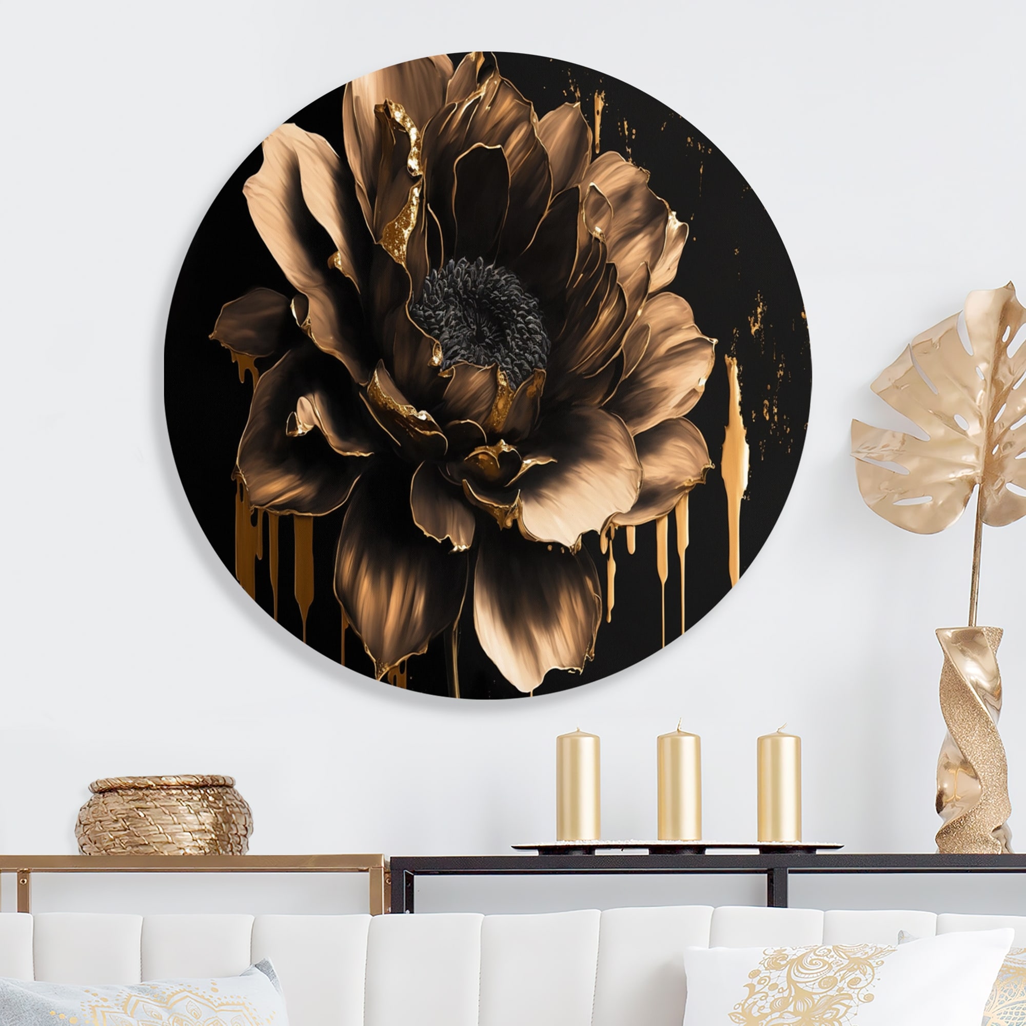 Designart 'Black And Gold Dahlia' Traditional Metal Round Wall Art