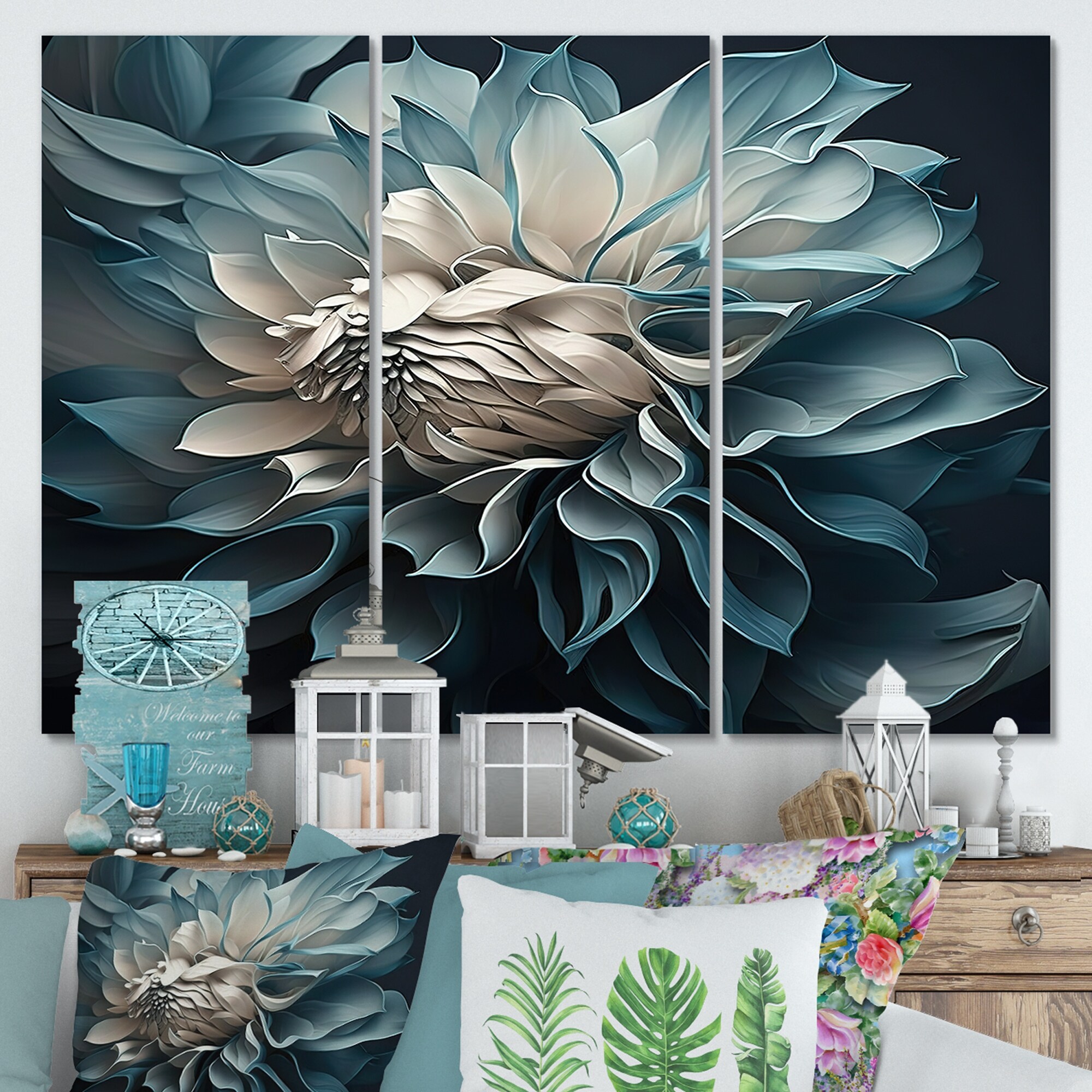 Designart "Blue And White Dahlia Flowers I" Floral Dahlia Canvas Art Print - 3 Panels