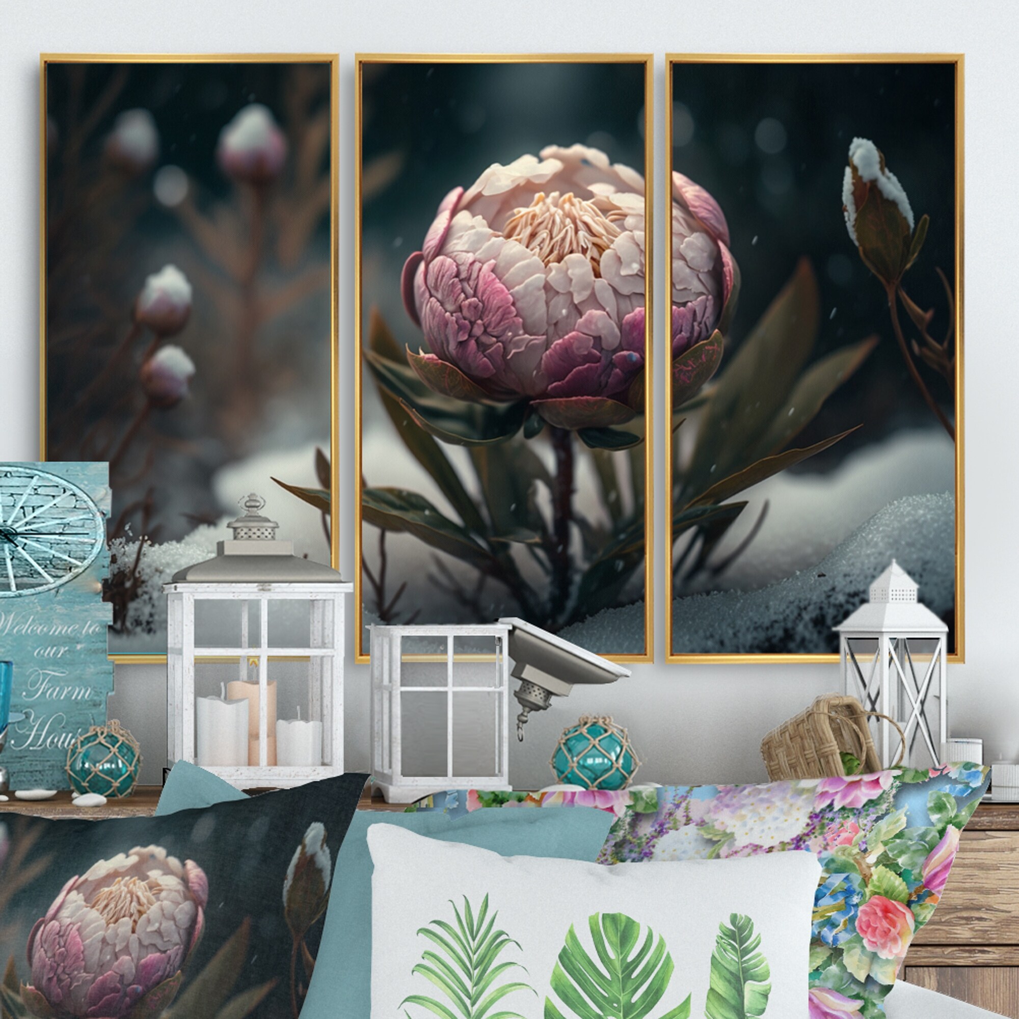 Designart "A Blooming Pink Peony Flower in Winter II" Floral Dahlia Framed Canvas Art Print - 3 Panels
