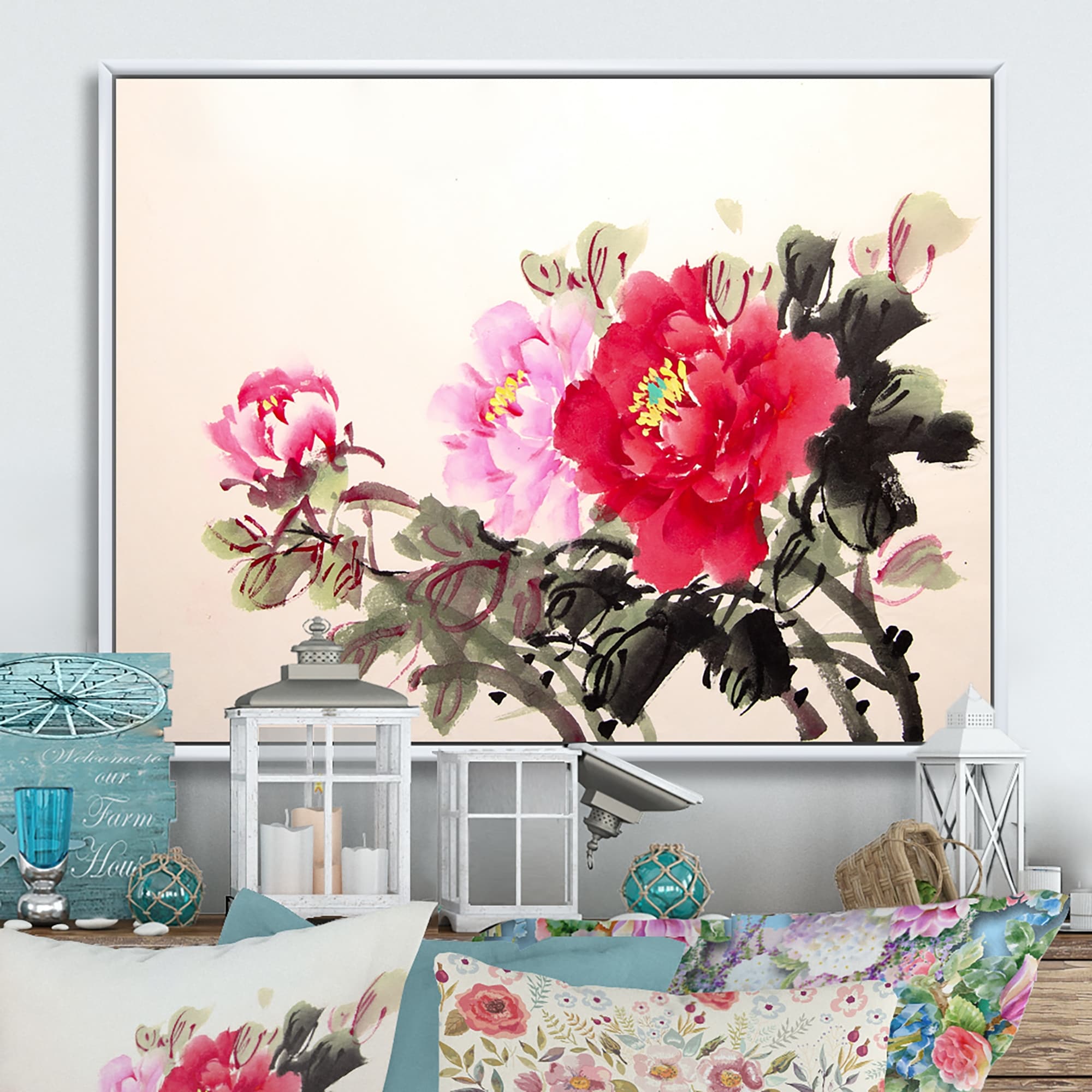 Designart "Chinese Peony Ink Drawing" Traditional Framed Canvas Wall Art