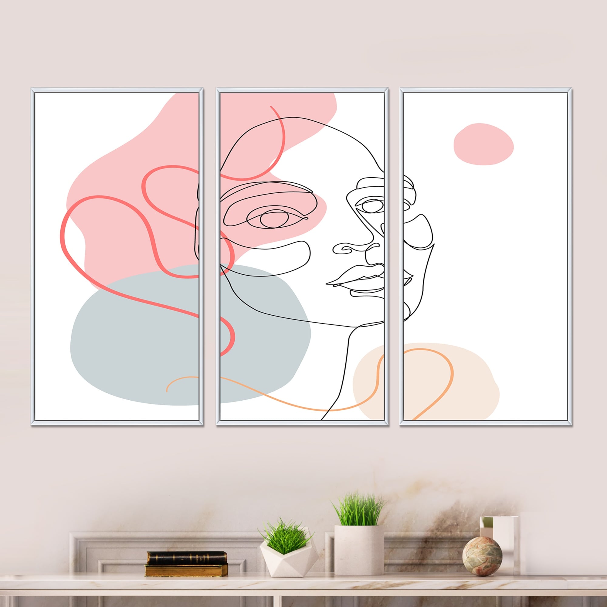 Designart "One Line Drawing of Young Woman in Pastel Tones" Modern Framed Canvas Wall Art Print Set of 3 - 4 Colors of Frames
