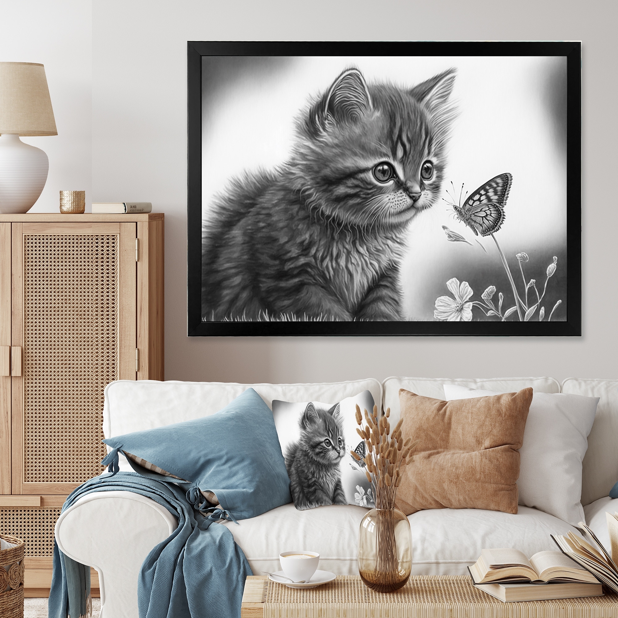 Designart "Digital Drawing of Little Kitten With Butterfly IV" Animals Cat Framed Art Print