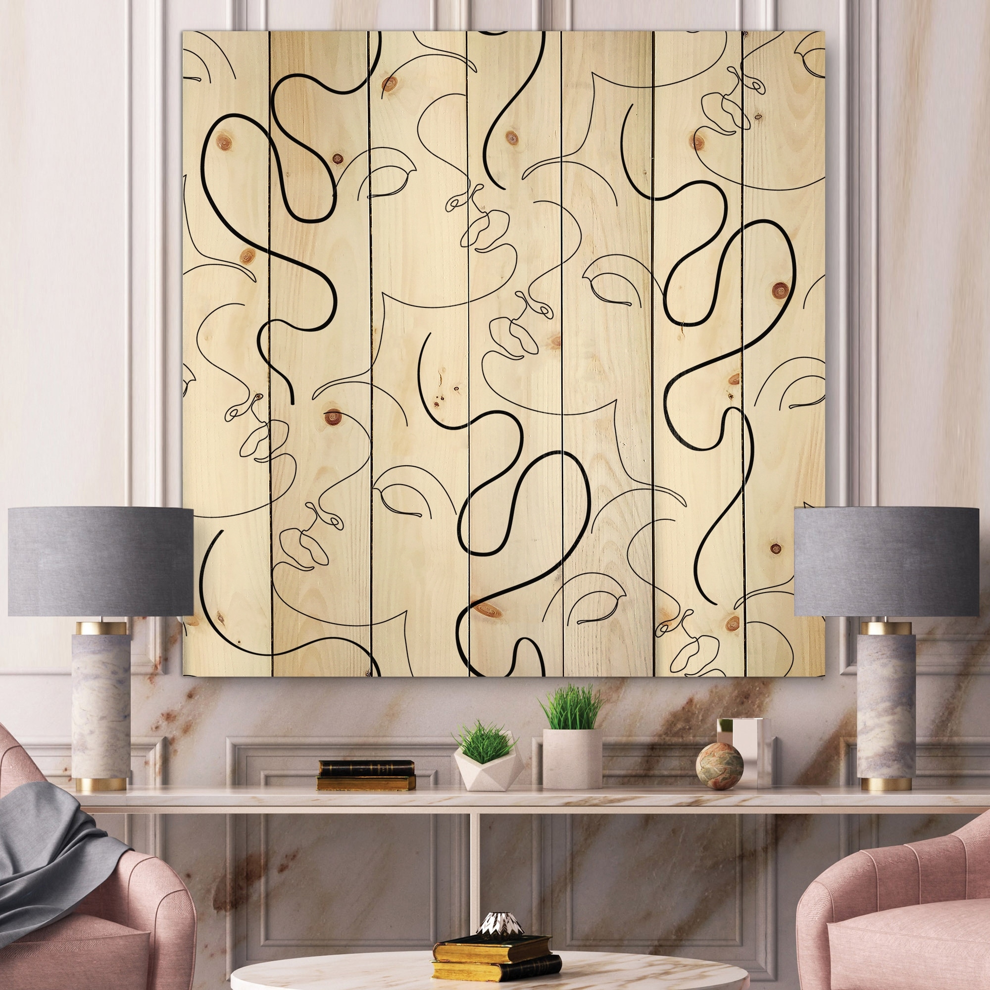 Designart 'Monochrome One Line Drawing Portraits' Modern Print on Natural Pine Wood