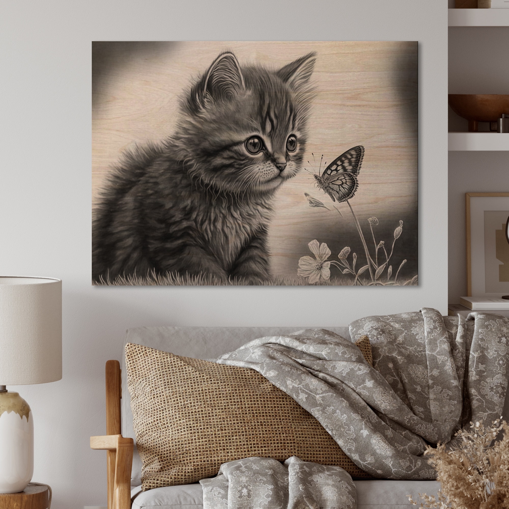 Designart 'Digital Drawing of Little Kitten With Butterfly IV' Animals Cat Wood Wall Art - Natural Pine Wood