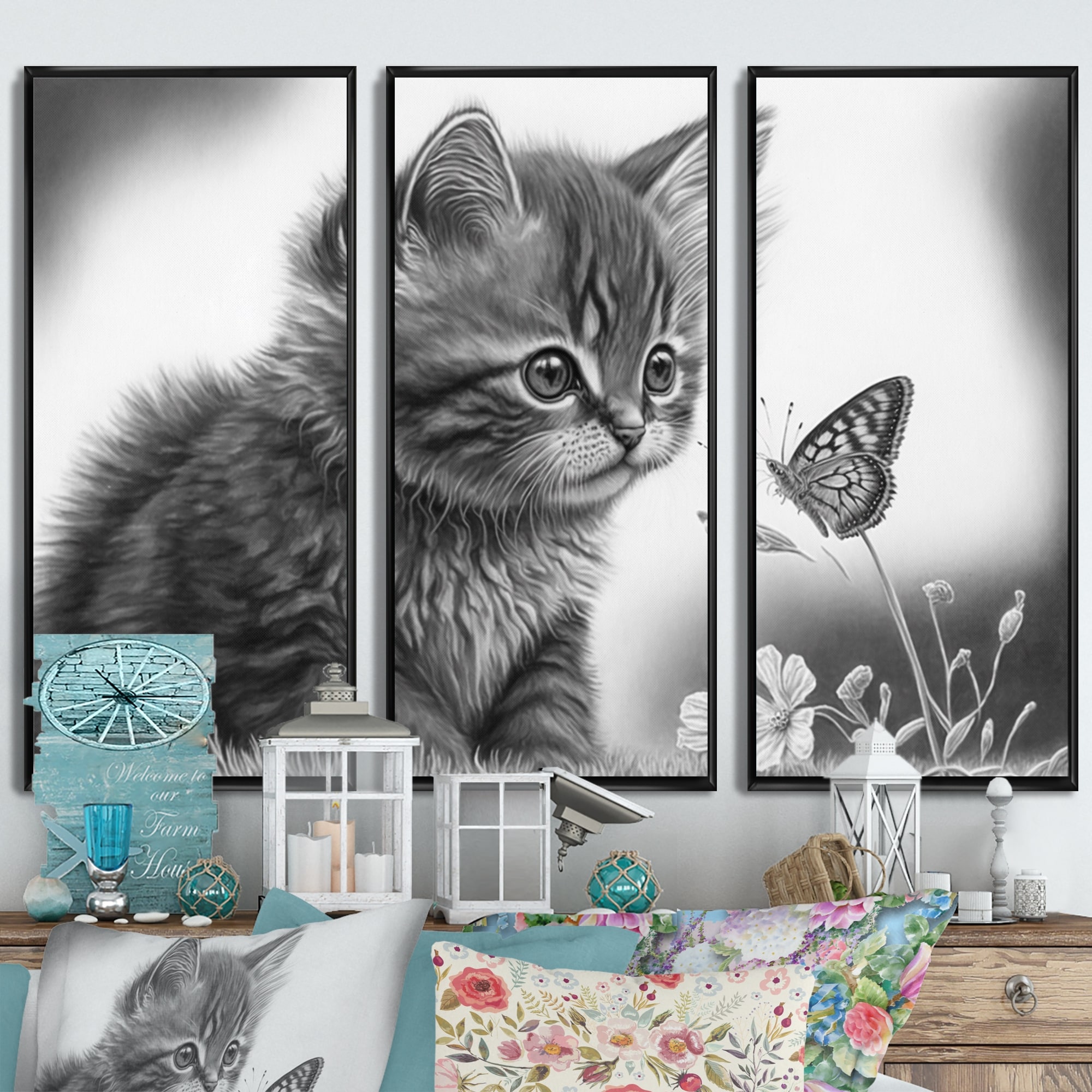 Designart "Digital Drawing of Little Kitten With Butterfly II" Animals Cat Framed Canvas Wall Art Print - 3 Panels